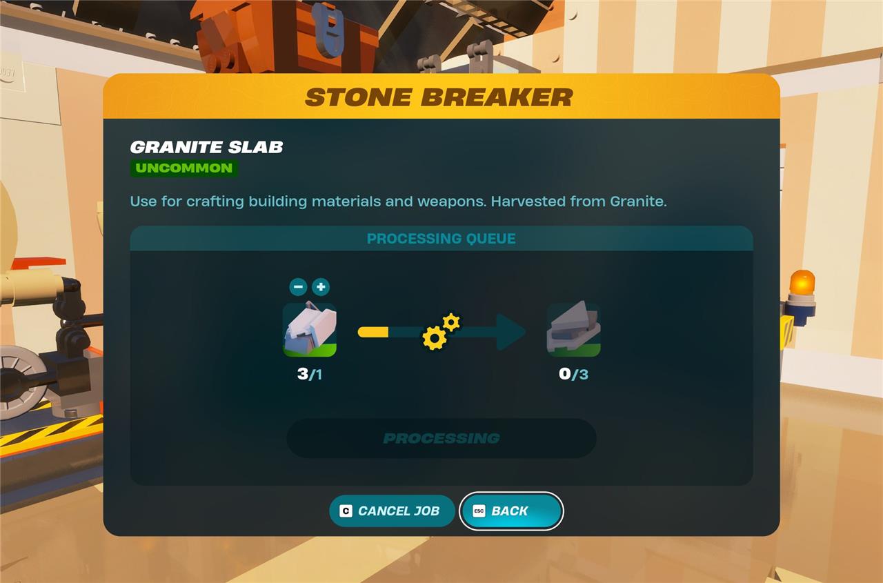 In LEGO Fortnite Odyssey, granite slabs are crafted by first gathering granite, which can be collected by picking up small rocks scattered across the overworld or by using a pickaxe to break larger boulders. Once you have enough granite-35 pieces-and 20 planks, you can build a Stone Breaker, a utility station that processes granite into granite slabs. After constructing the Stone Breaker, place your granite inside, select the granite slab recipe, and wait about 10 seconds per slab for the transformation. Granite slabs are essential for crafting many buildings and items early in the game, making the Stone Breaker a crucial tool for progression.