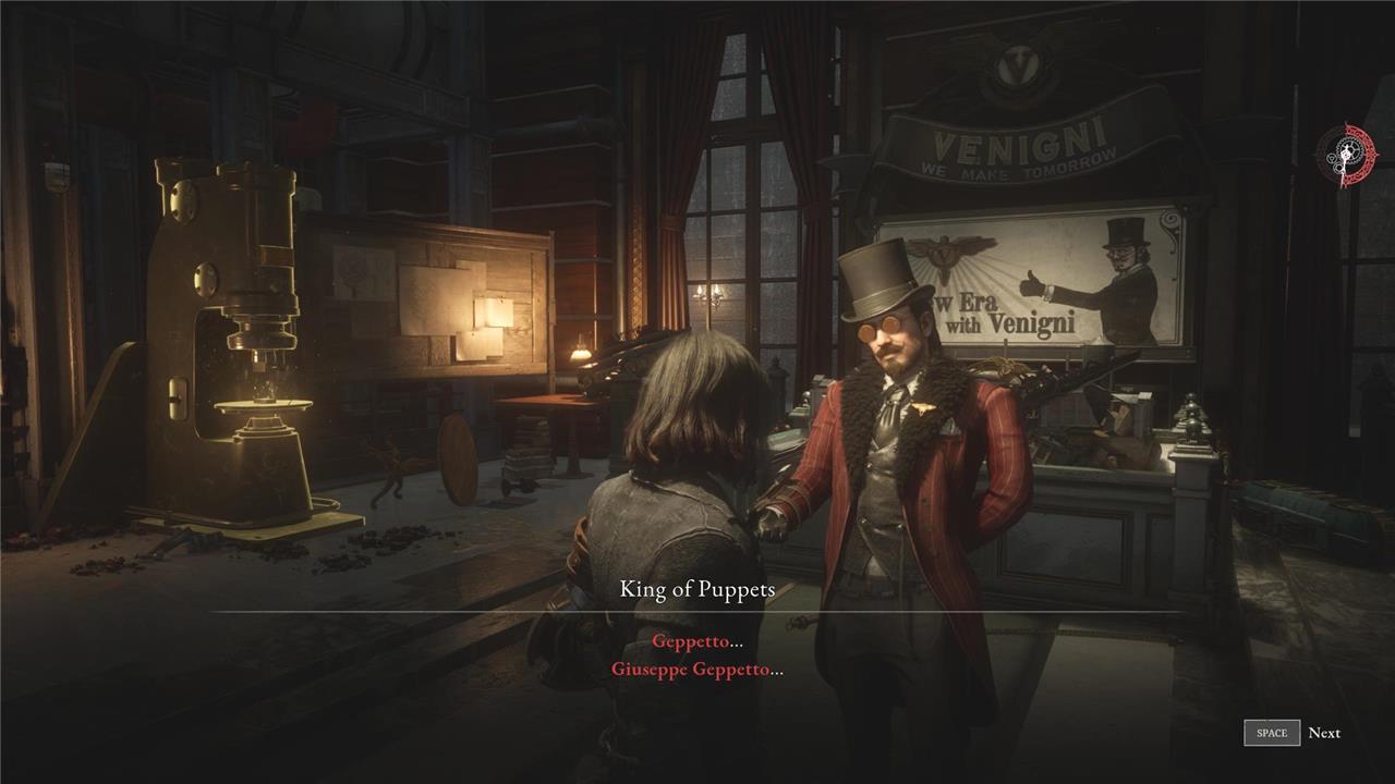 - Location: Hotel Krat and Relic of Trismegistus – Once you’ve cleared the Black Rabbit Brotherhood 2.0 encounter, return to Hotel Krat and talk to Venigni. You’ll then hear a message repeatedly saying the name of Geppetto.
