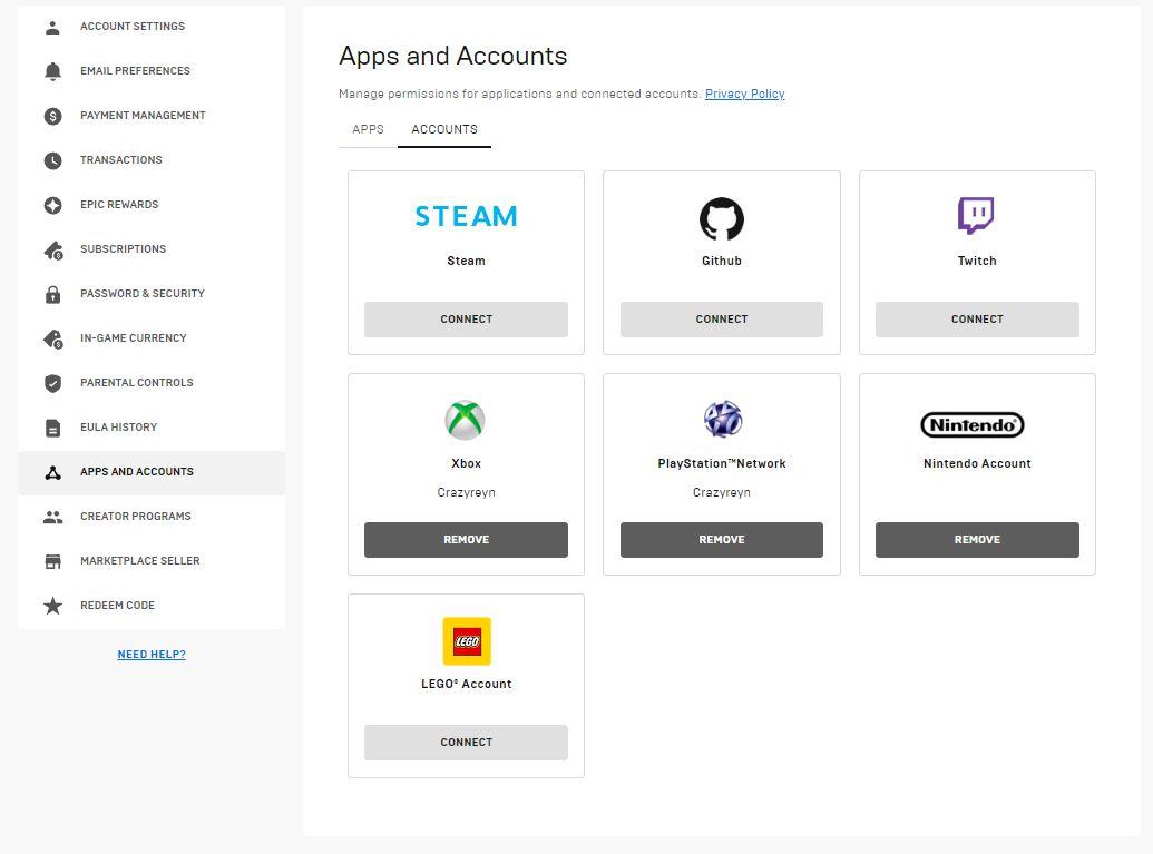 - Once logged into your Epic Games account, visit the “Apps and Accounts” area, which you can visit directly here. This will show all your connected accounts at a glance, including for the likes of Xbox, PlayStation, and Nintendo. Click “Connect” below the LEGO Account box.