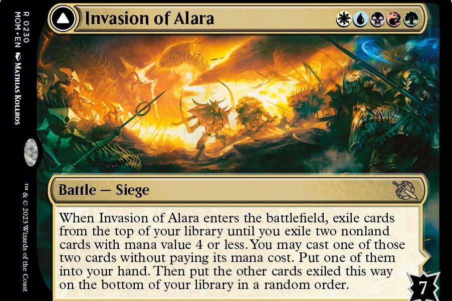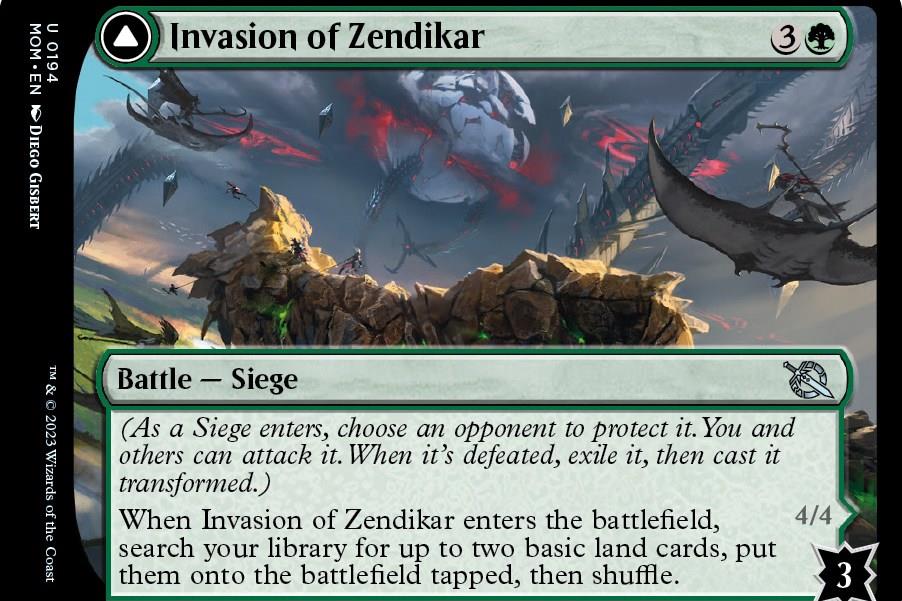 Consider the other three- and seven-defense battles, Invasion of Zendikar and Invasion of Alara. Zendikar transforms into the Awakened Skyclave, a big creature that can block well and even tap for mana. Alara transforms into Awaken the Maelstrom, a powerful sorcery, which draws you more cards, lets you play artifacts from your hand for free, destroys an opponent’s permanent, and also makes your own creatures bigger. It’s a lot of text, but feels appropriate for the time spent removing all those counters.