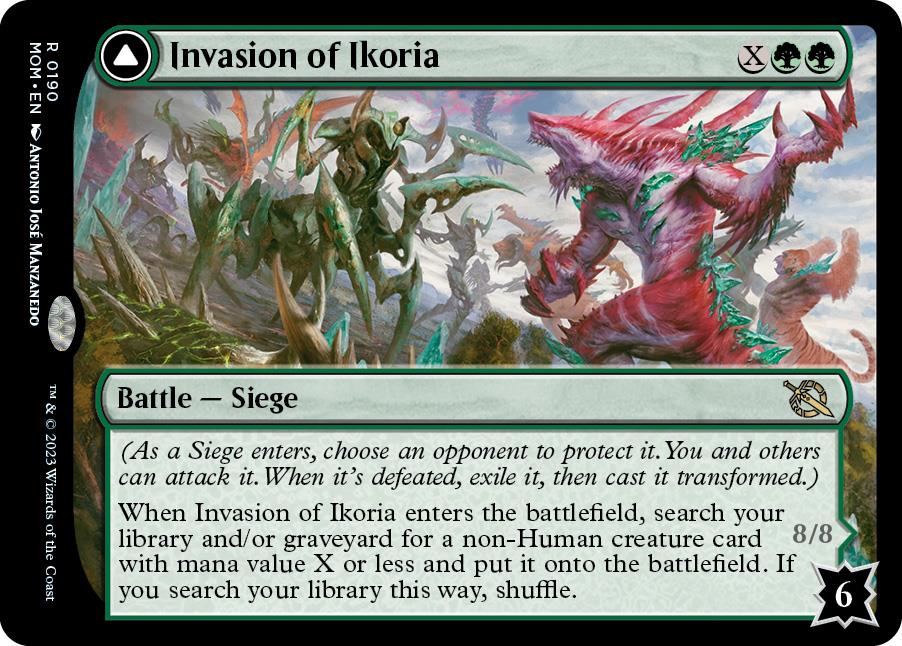 Unlike most of the other battles, Invasion of Ikoria costs two green mana plus X, where X is as much additional mana you want to sink into the card’s casting cost. You can then search your deck for a creature whose mana value equals X or less, and put it directly on the battlefield. In other words, for an extra two mana, you can play any creature you want, depending on the state of the game and the mana that you have access to.
