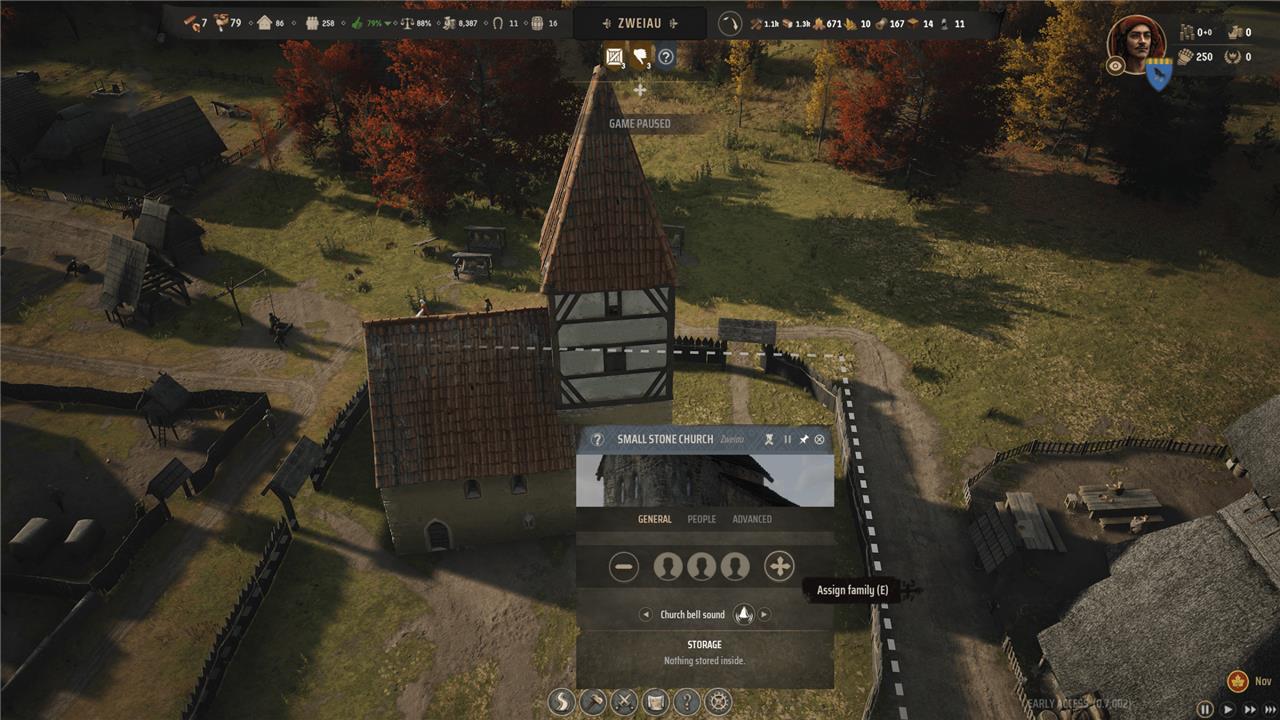 Strategic Placement: Build in ideal locations, considering factors such as elevation for important buildings like churches and manors. Place your manor on a scenic elevation overlooking the town and roads.