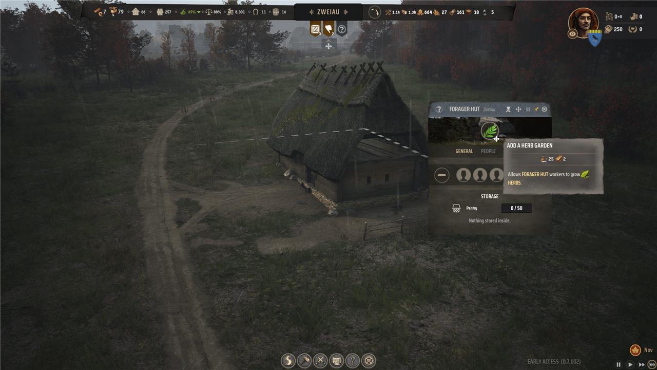 One final upgrade that’s a bit harder to notice is the add a herb garden (25 Regional Wealth, 2 planks) for a forager hut. There’s a mechanic happening in the background where your townsfolk can get sick – all you might see about this is a quick notification. This is probably going to become more obvious and visible as the game continues through its early access.