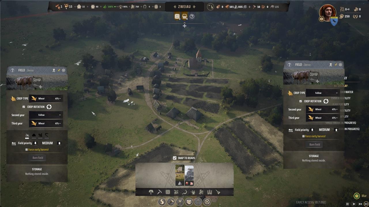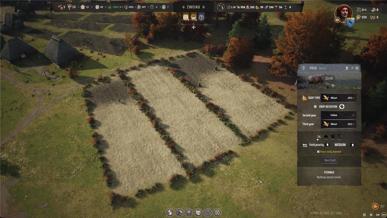 Starting with small fields in Manor Lords is crucial for efficient farm management and a successful harvest. While it might be tempting to lay out large plots immediately, smaller fields are much easier for your limited early workforce to handle, ensuring that each stage-plowing, sowing, growing, and harvesting-can be completed on time. If your fields are too large, your villagers may not finish the work before the seasons change, leading to reduced yields or even crop loss. By keeping your fields manageable, you give your farmers the best chance to fully tend to their crops, maximize output, and gradually expand as your settlement and labor force grow.