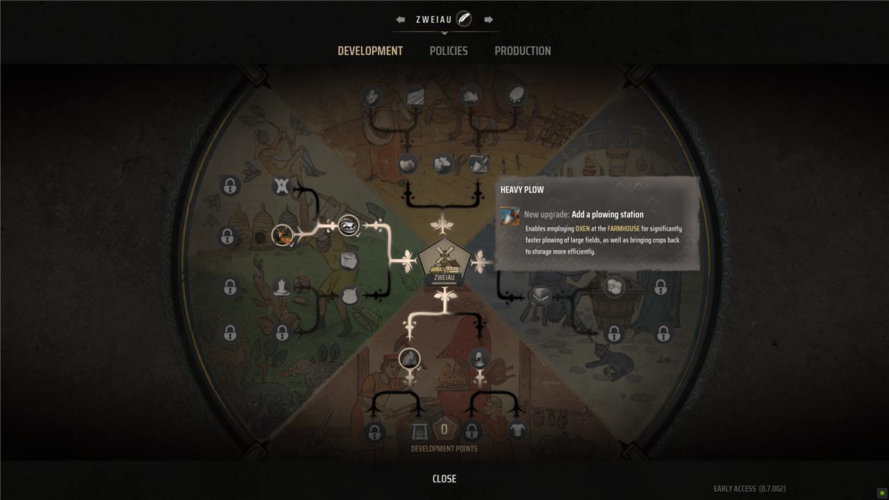 As you level up your town, you’ll earn development points that unlock new technologies for your town to use. One of the first you can get is the heavy plow. This lets you add a plowing station to your farm and use an oxen to plow and move crops. This increases the area a family can handle by quite a bit – to the point where you can basically double the size of your fields (or just have twice as many fields and crops).