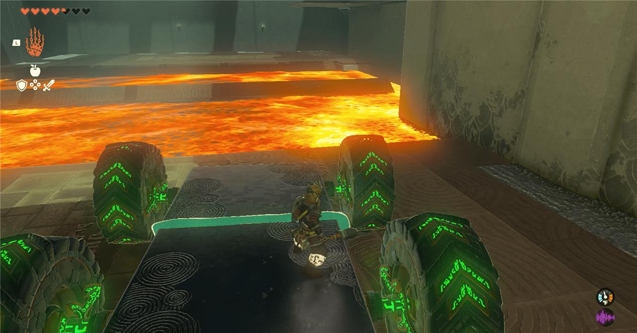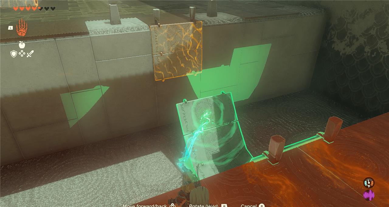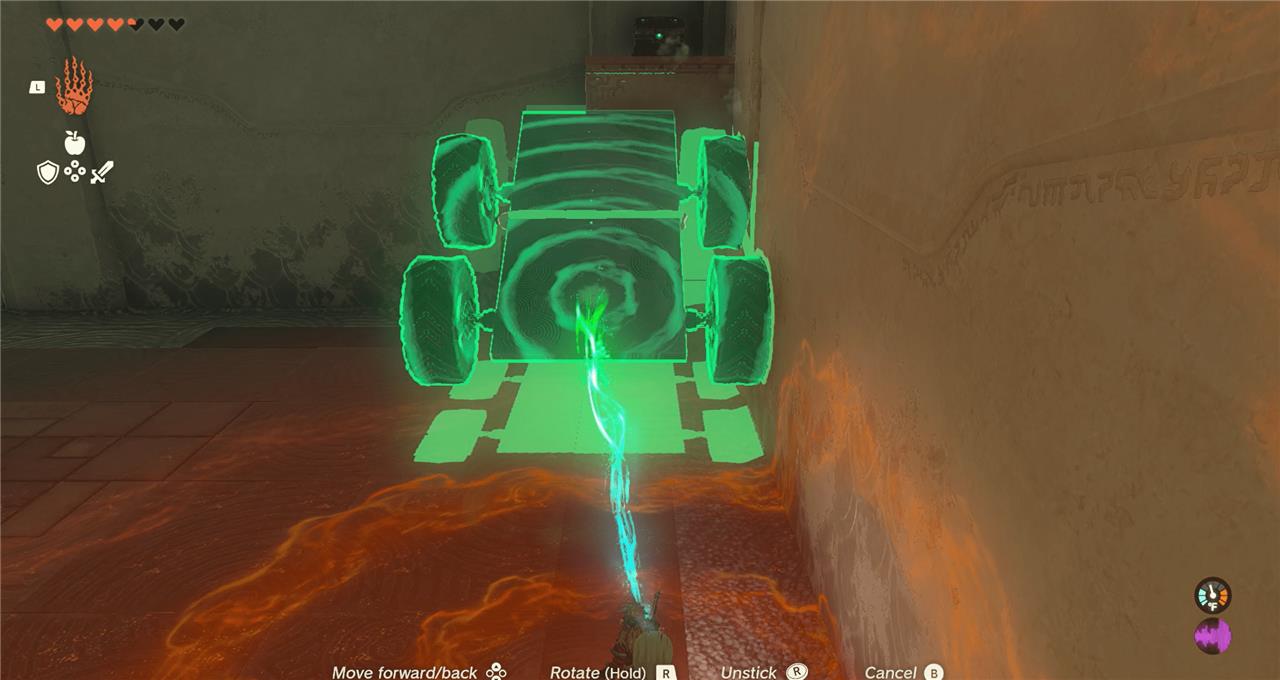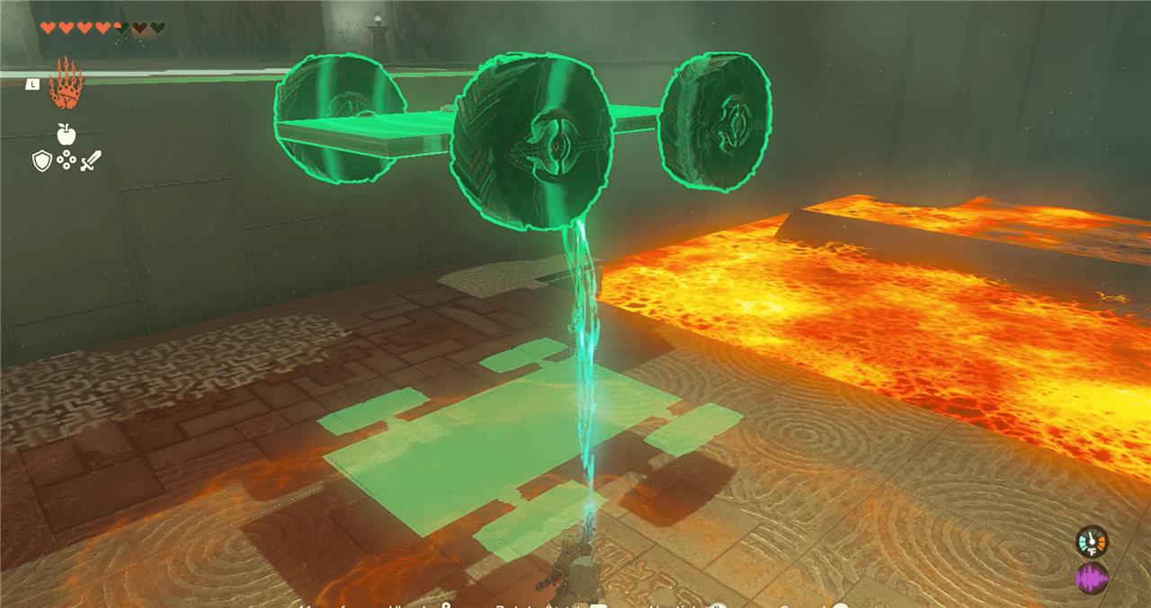 3. Next, there’s a fiery pit to cross. In front of you, there’s a pile of panels to make a bridge and to the right of that, a wheeled mechanism. Take the wheel mechanism and use Ultrahand to attach it to the front of the pile of panels. Hit the wheels to activate them and they’ll pull the panels across the fiery pit to make a bridge. Cross over.