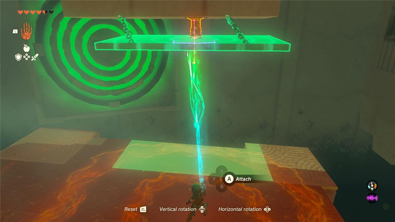 A hanging platform blocks the right target; grab the nearby stake with Ultrahand, attach its flat end to the platform’s front, lift and rotate to pin the spiky end into the wall above, moving it aside.โ