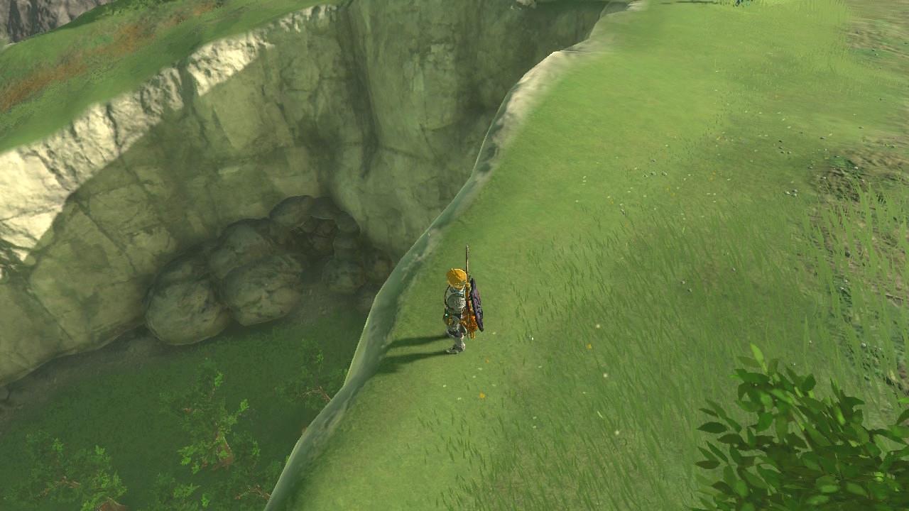 2. Exit Hateno Village Research Lab and walk to the edge of the bendy road’s first cliff, where you see the patch of apple trees. (Around coordinates 3769, -2104, 0249.) Look to the left and you’ll see a pile of rocks – they’re breakable. Go break ’em.