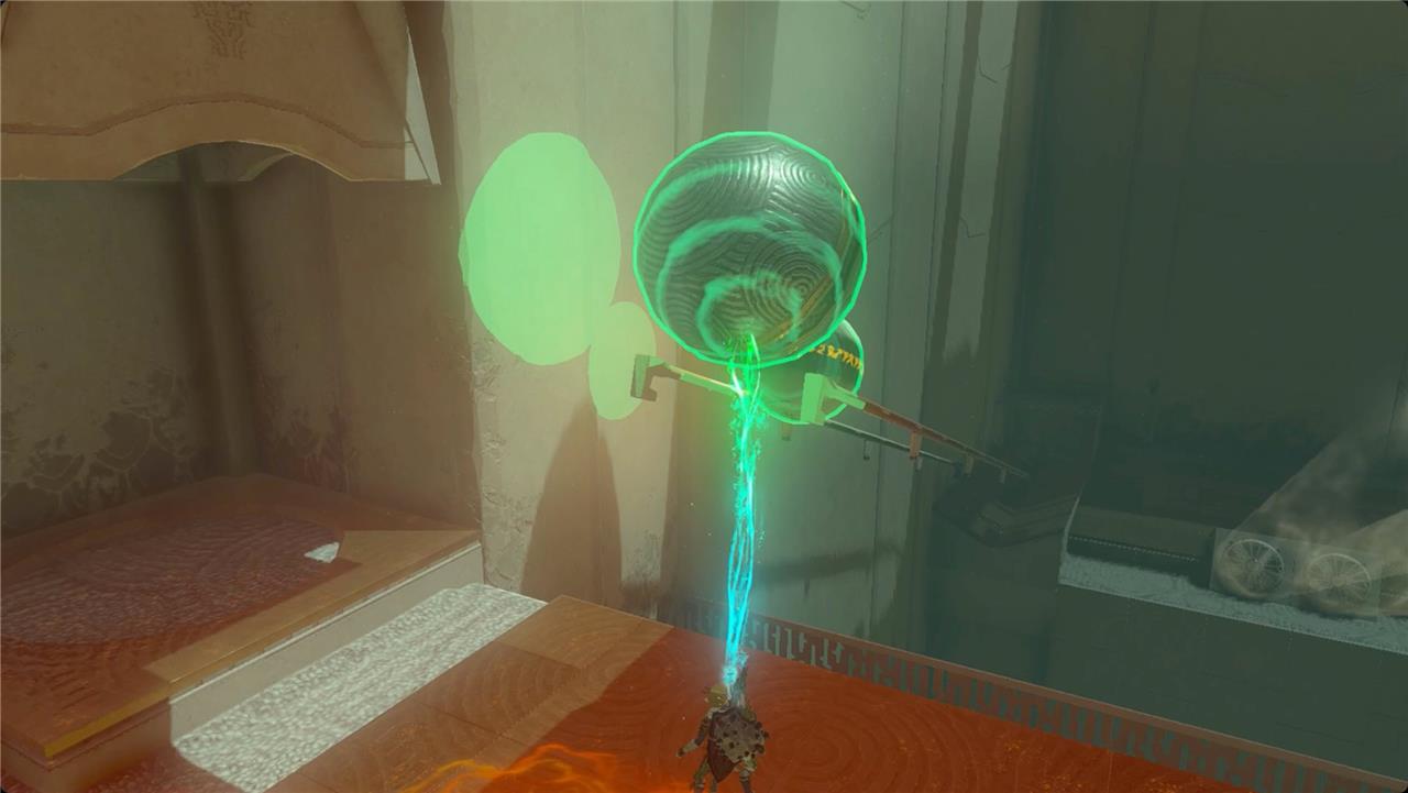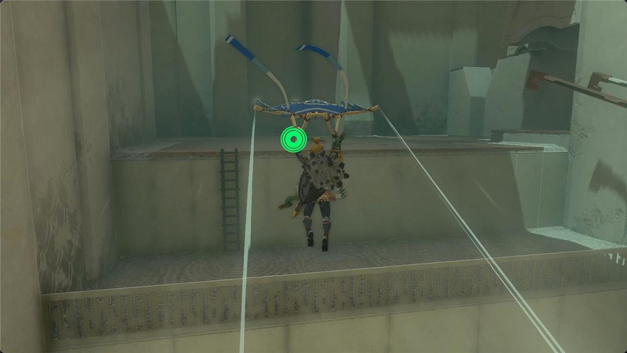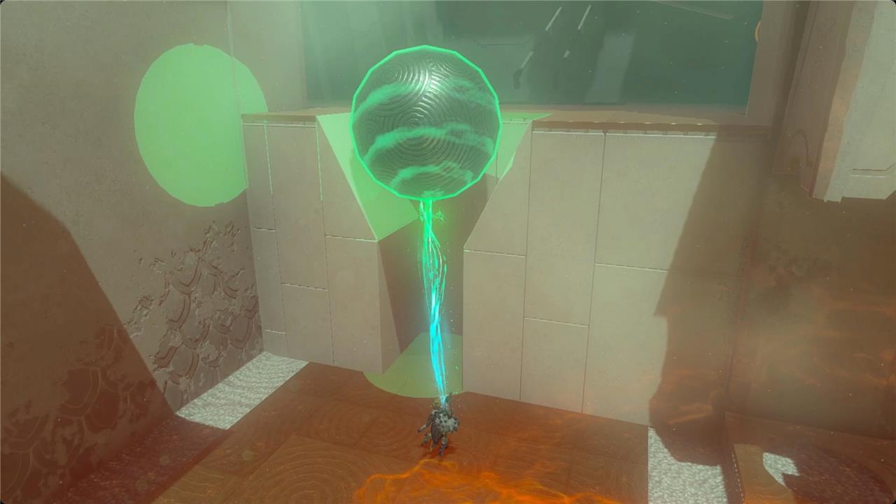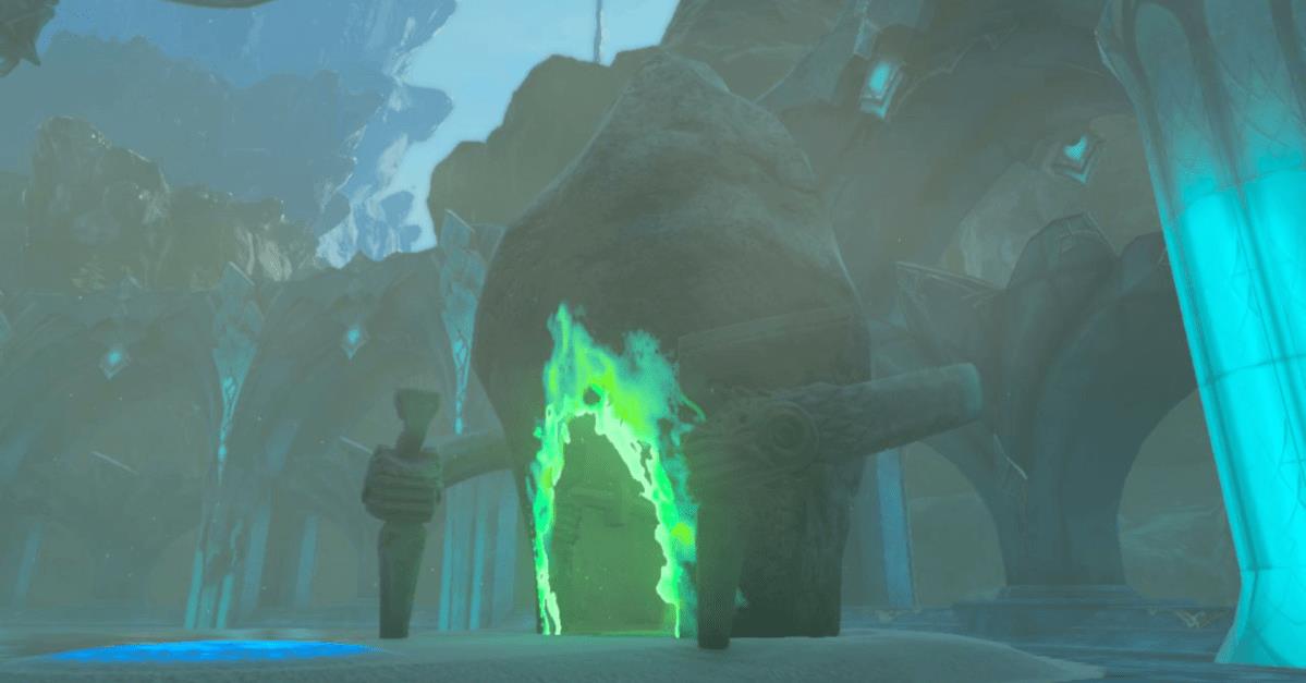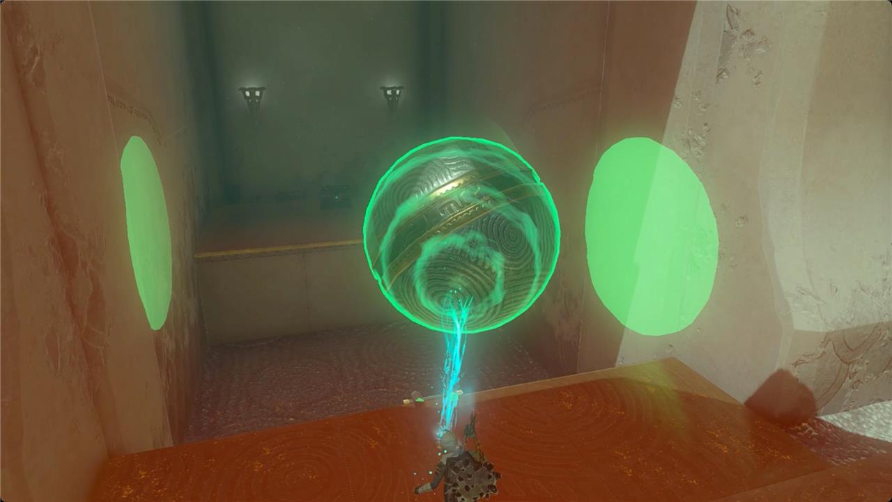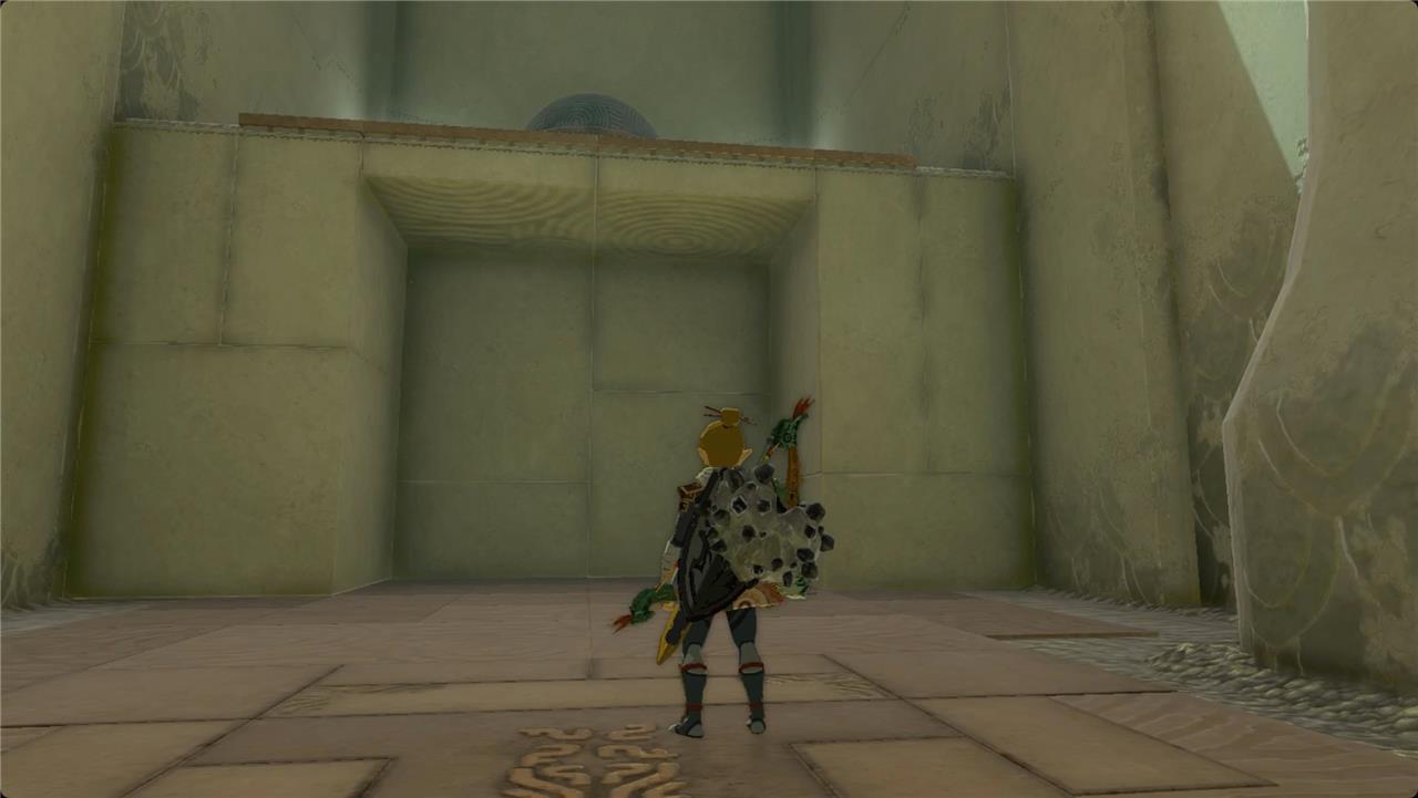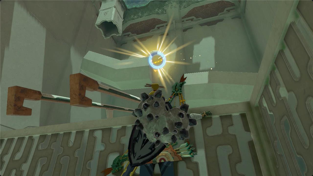 Place the attached spheres on the entrance rails with the large one first (to prevent overshooting). Paraglide down after them, catch with Ultrahand at the bottom, and detach the small ball into the floor bowl to open the gate. Proceed to the altar for your Light of Blessing.โ