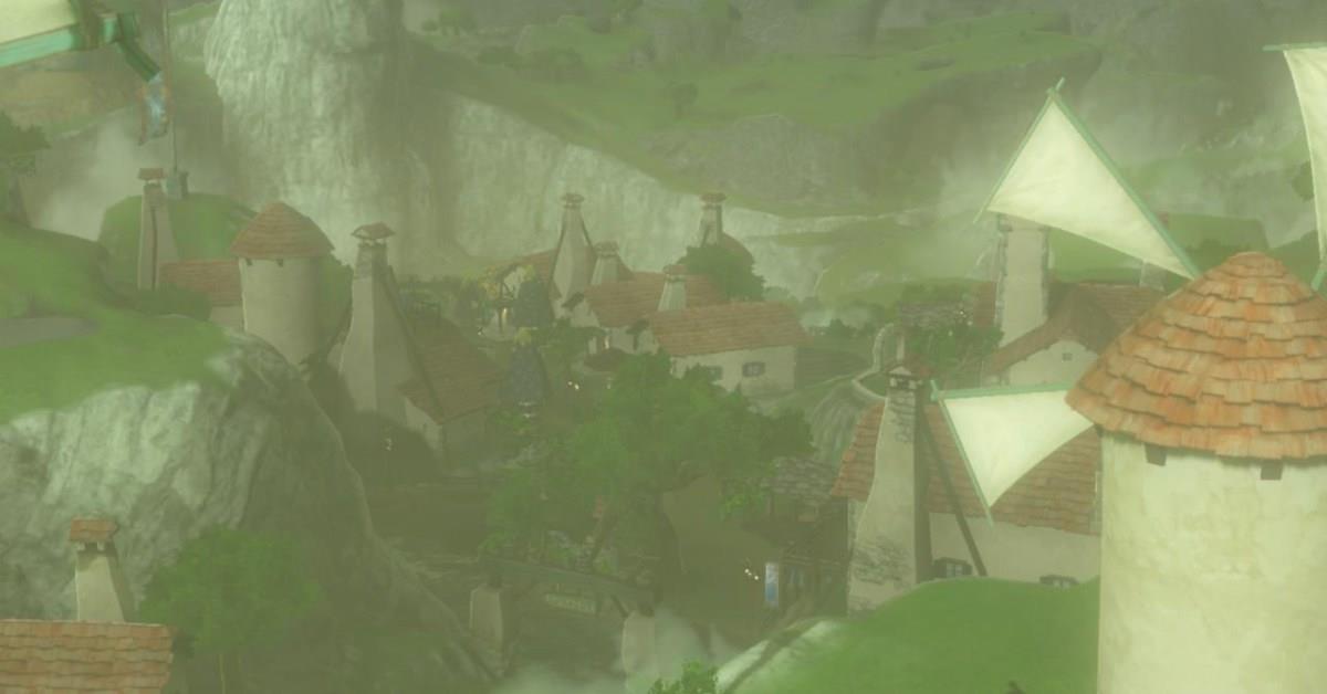 Launch from Rin Oyaa Shrine (southeast edge near Snowfield Stable) or Lindor’s Brow Skyview Tower for a broader aerial view-glide southeast into the canyon and adjust mid-flight toward the temple ruins. Alternatively, warp to Mogg Latan Shrine on Satori Mountain and paraglide down from its heights.โโ