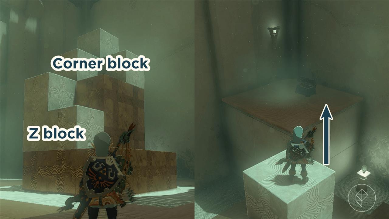7. Inside the second puzzle room, you’ll find a 3×3 cube on the left, an incomplete cube on the right, and three shaped blocks on the right. For clarity, we will be naming the blocks from left to right – corner, L, and Z. If you need an image reference, check the second image in the gallery above.