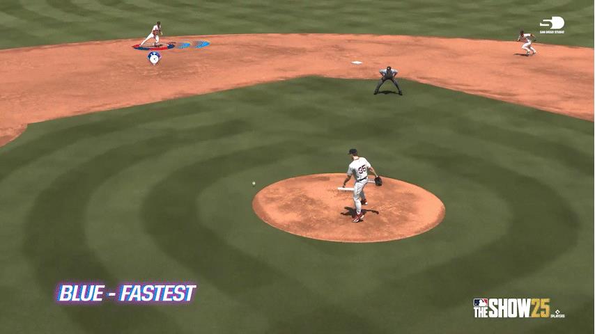 This is actually a change that Sony San Diego made for MLB The Show 24 last year, but the game didn’t communicate it to players in any way. Now there’s a visual indicator of how good a jump your infielder got on a ball: blue for the fastest reaction time, green for an average one, and yellow for the slowest. The gameplay connection here is that the fielding animation you see corresponds to the reaction time. Even if three shortstops with varying skill levels can each get to the same hypothetical ground ball, an elite defender will be able to field it more cleanly than the others, and transition to a throwing animation more smoothly and quickly; meanwhile, the lower-level fielders may stumble a bit as they pick up the ball, delaying their throw enough to allow the runner to reach base safely.