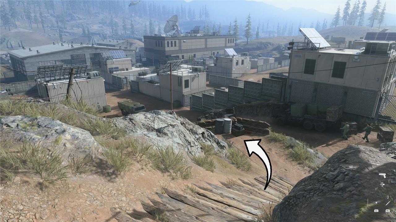 You’ll see a guard beside a security cabin. They’ll start moving toward you as you head to the road. Wait until it’s safe to go behind them. You don’t need to worry about being seen by the soldier in the cabin, though.