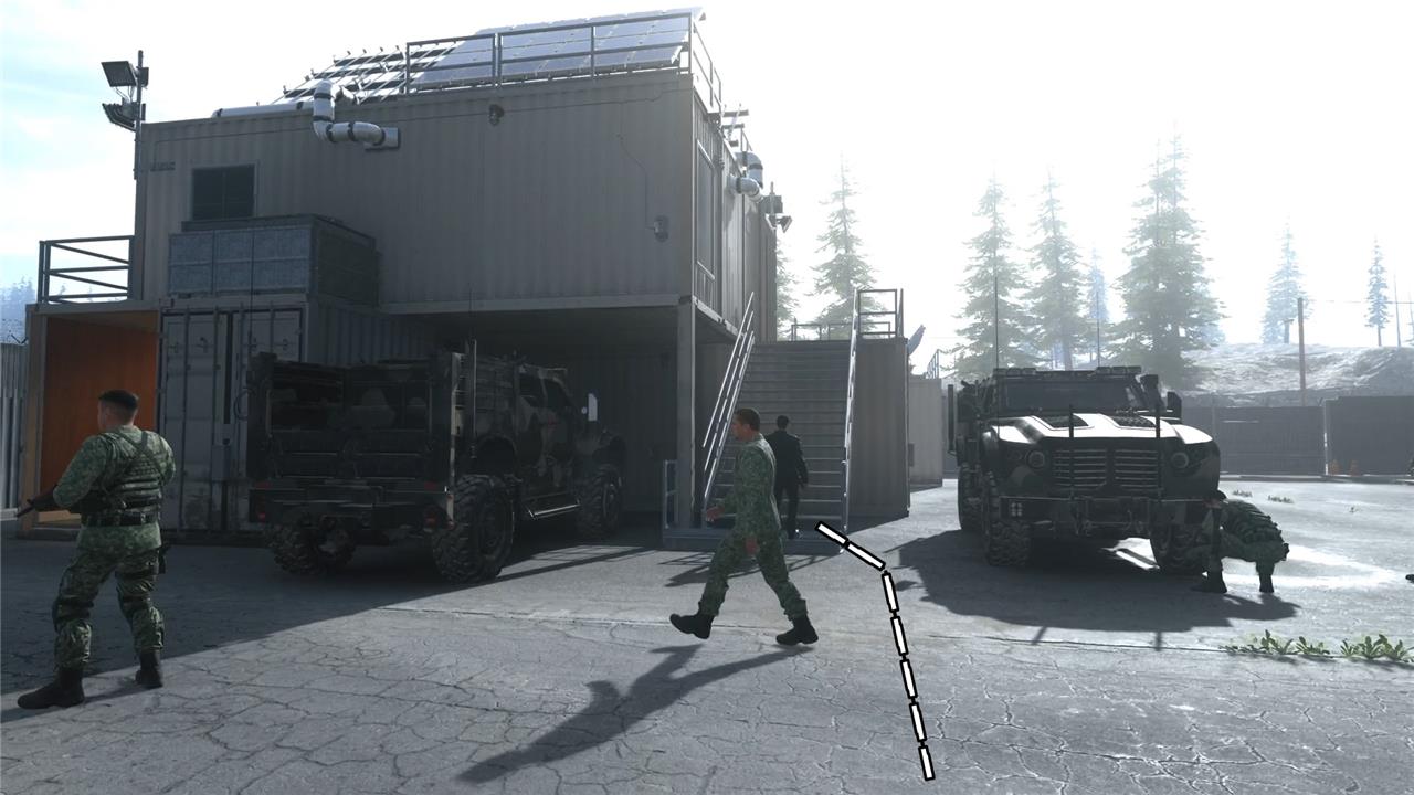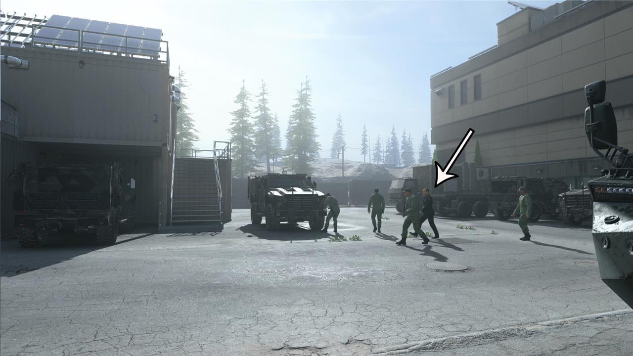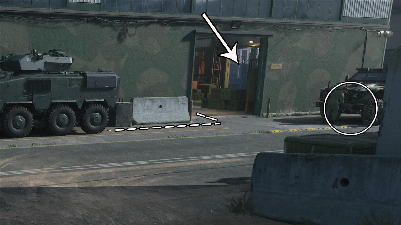 Right after you leave the unpaved road, you’ll find an entrance to a building. Use it to pass through the next section safely. Stay away from the two soldiers working on the truck close to the door. Leave the building using the other entrance and get back to the main area.