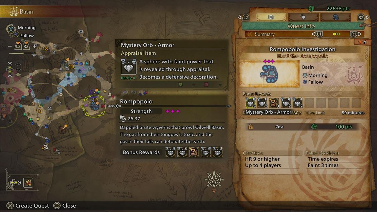 As you can see, this Rompopolo offers four bonus weapon and armor decorations, guaranteed. However, these are rarity 4, which means they are going to be fairly basic at best. Instead, there’s a Rathalos here that offers six decorations, two of which will be rarity 5. It’s better to hunt that instead, since there’s a chance that they will be higher-level decorations.