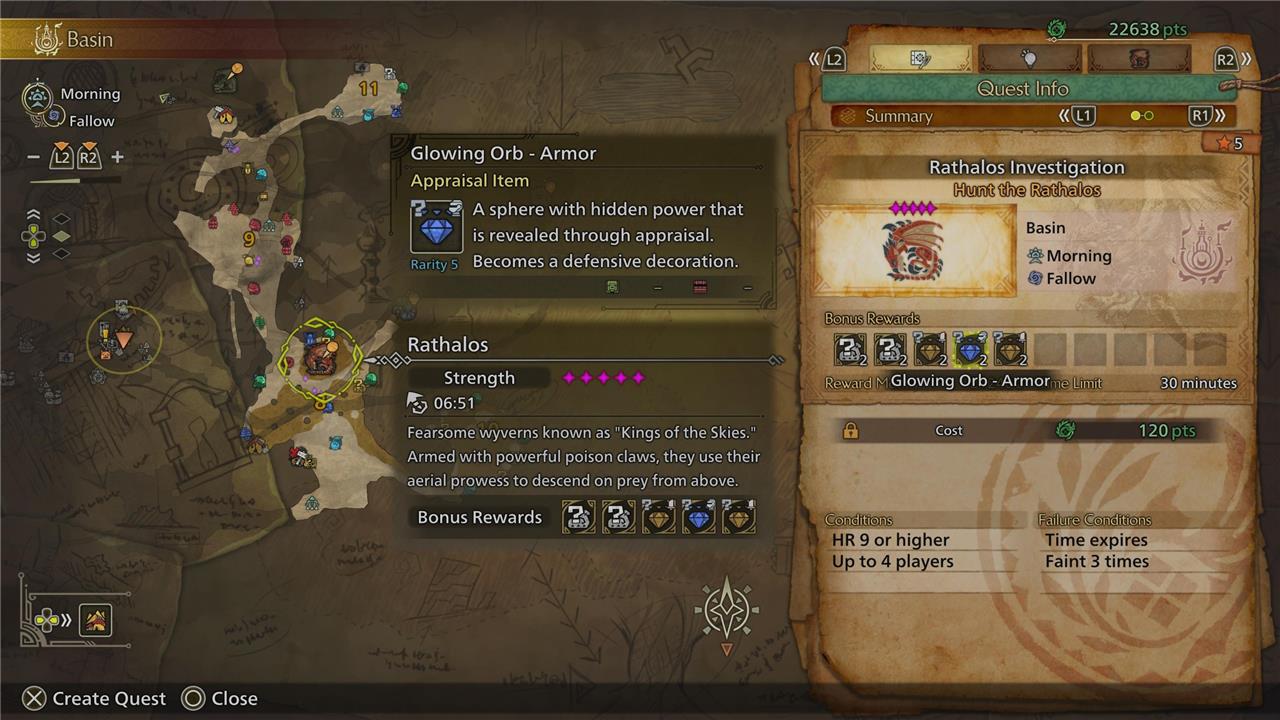 Pro tip: The timer here says the Rathalos will depart in 6 minutes and 51 seconds. Instead of trying to race there and risk it leaving, set it as an investigation. This allows you to hunt it down at your own leisure by talking to Alma. You also get three attempts at it, if you think you’ll struggle. This is incredibly useful if you see something powerful with, for example, a guaranteed Rathalos Ruby that you need for an upgrade.