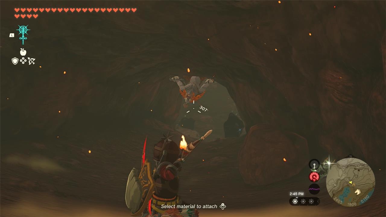 3. In the first big cave chamber you’ll find rock clusters blocking doors to the north and east. Whether you use hammers, bombs, Zonai time bombs, or Vow of Yunobo, Sage of Fire to break through the north cluster to find an Igneo Pebblit and a chest containing a mighty Construct bow.