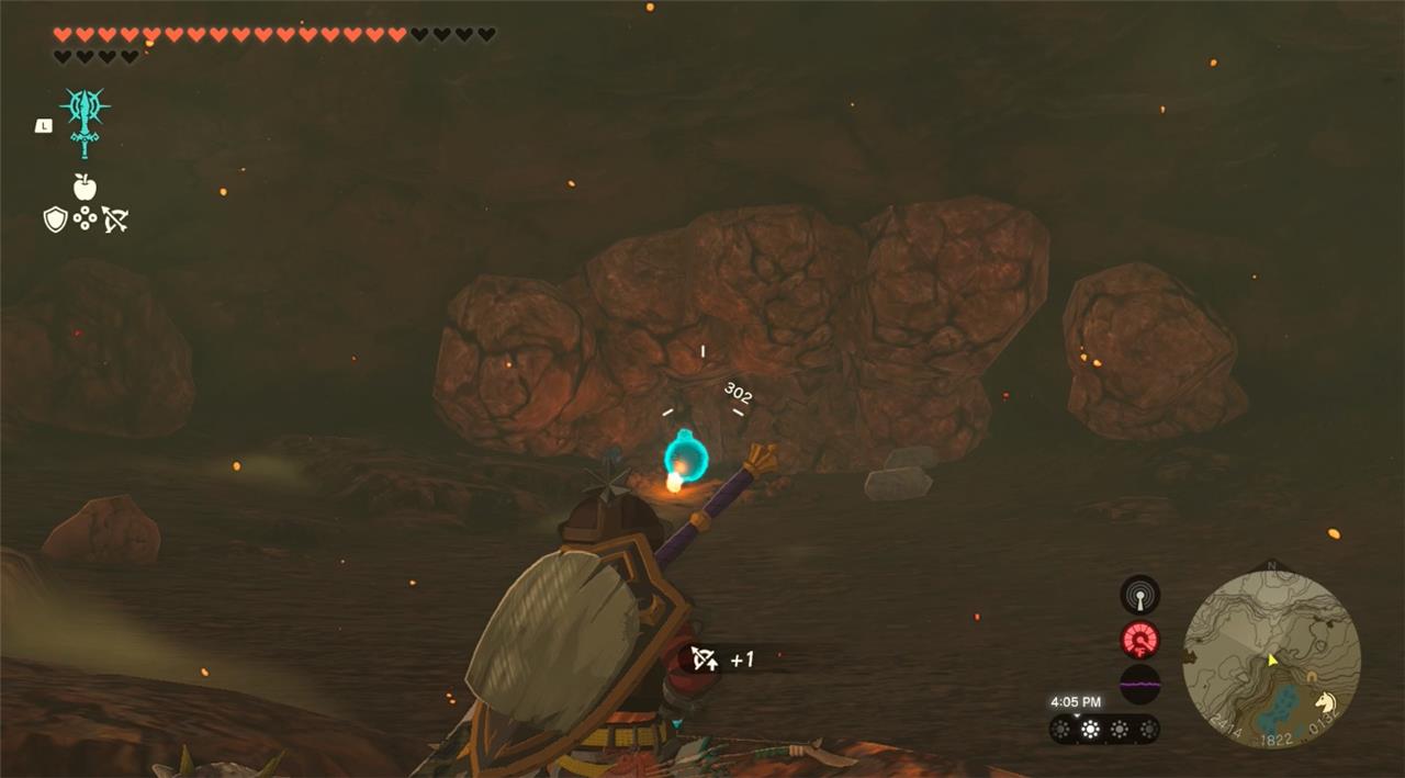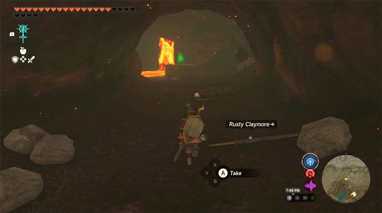 5. Crack open the rocks to the left to reveal a lava lake antechamber containing a green shrine crystal and a Fire Like. Defeat the enemy, and below it’s the place on the wall find a chest containing a steel Lizal shield.