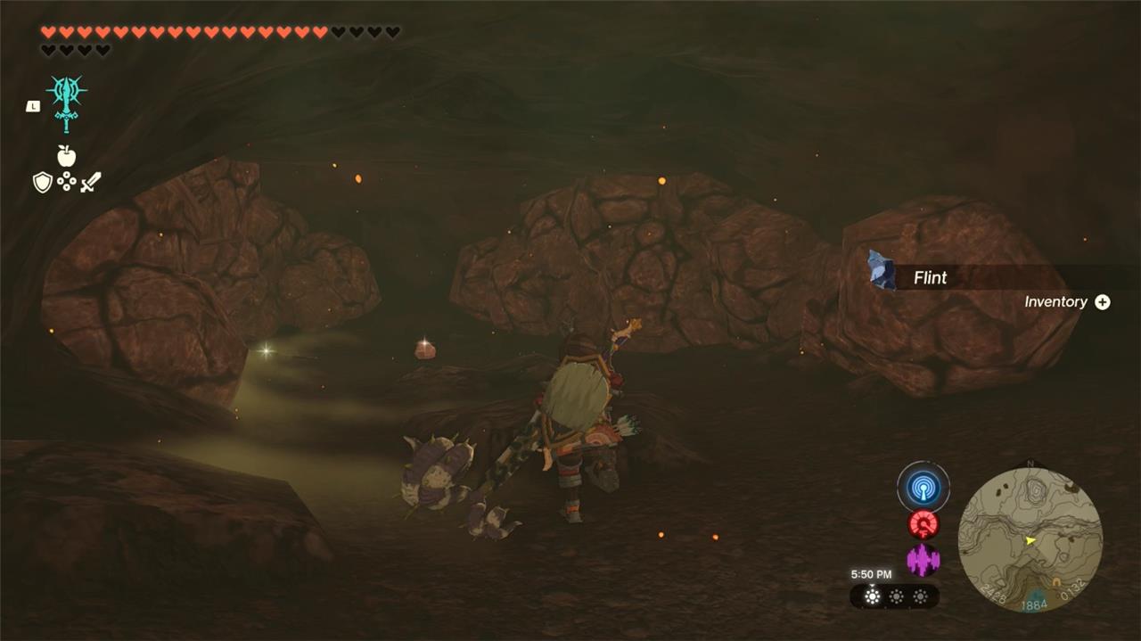 Lake Intenoch Cave hides several enemies and puzzles leading to the Moshapin Shrine, which requires careful exploration to access. Inside the cave, defeat the monsters guarding the area and use abilities like Ascend or Ultrahand to reach higher sections. Breaking large rocks with Bomb Flowers can reveal hidden paths and treasure chests. After reaching the inner chamber, activating the shrine starts a gravity-based puzzle where you must adjust the ball’s movement with fans and ramps until it reaches the goal switch, completing the shrine challenge.