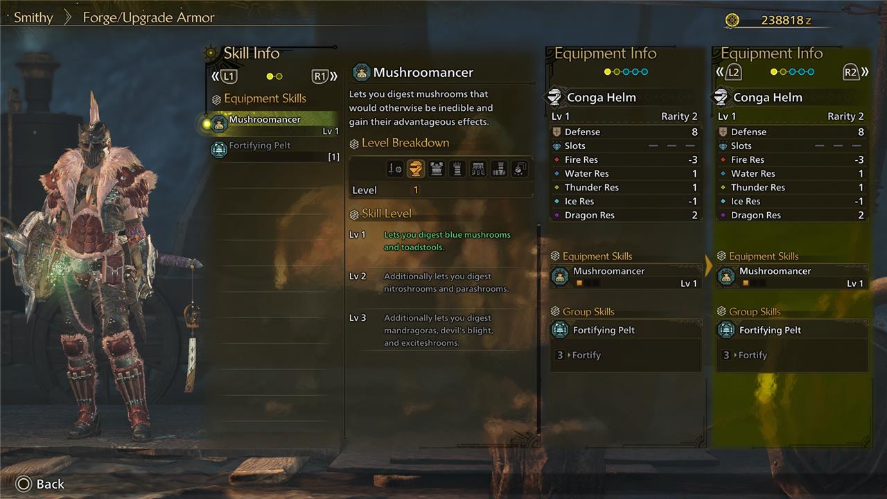 • After each hunt, immediately forge any Conga armor pieces you have enough materials for, focusing first on the Conga Helm, Mail, or Greaves, as these grant Level 1 Mushroomancer.