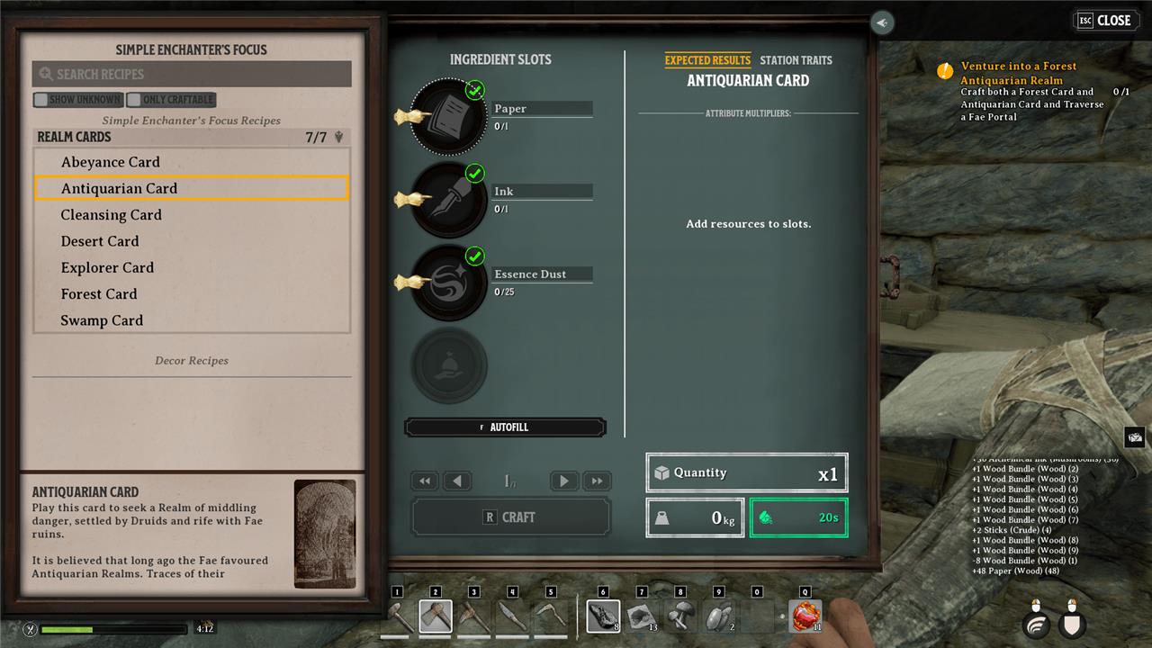 After unlocking the Antiquarian Major Card recipe by completing the Antiquarian Site of Power and defeating the Fabled Automaton Knight, you can craft the card at your base using a Simple Enchanter’s Focus. Gather the required materials: one Paper (crafted from wood bundles at a sawing table), one Ink (made from refined pigment and glass at a mortar station), and 25 Essence Dust. Once you have these, combine them at the Enchanter’s Focus to create the Antiquarian Major Card, which is essential for progressing to new realms in Nightingale.