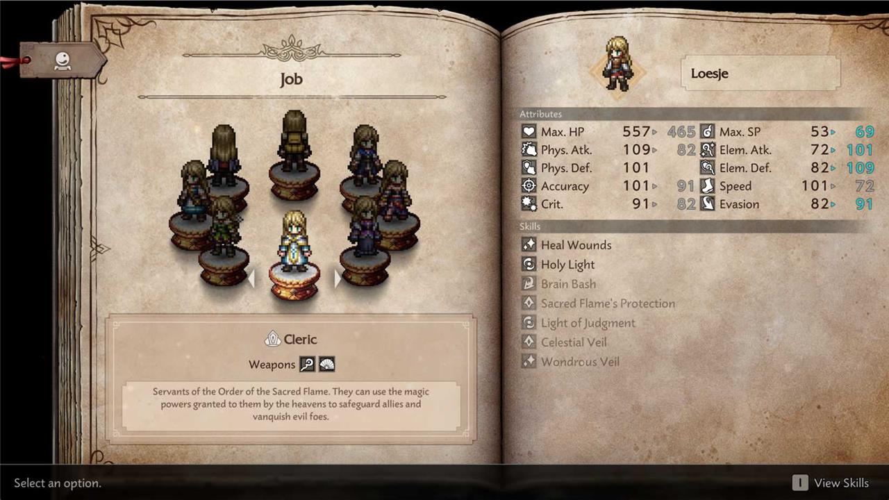 As a sort of combo between a Scholar and an Apothecary, the Cleric has a bunch of amazing light damage attacks and healing abilities. While the Cleric may also heal an entire row at once, they don’t have the Apothecary’s revive ability. Furthermore, while they can bestow an effect on allies to help them recover SP points based on their damage taken, this isn’t quite as effective as the Merchant’s proactive variation of that skill.