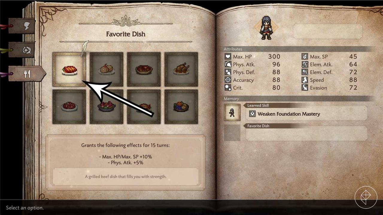 Use your chosen dish during a battle to gain 10% max HP/SP for 15 turns. Each dish also grants a 5% bonus for one other stat: Speed, physical attack, accuracy, etc. Since you probably haven’t developed a specific playstyle yet, it’s best to pick the dish that boosts your physical attack – you’ll likely hack away at your foe a few times during those 15 turns, so this buff will never be wasted.
