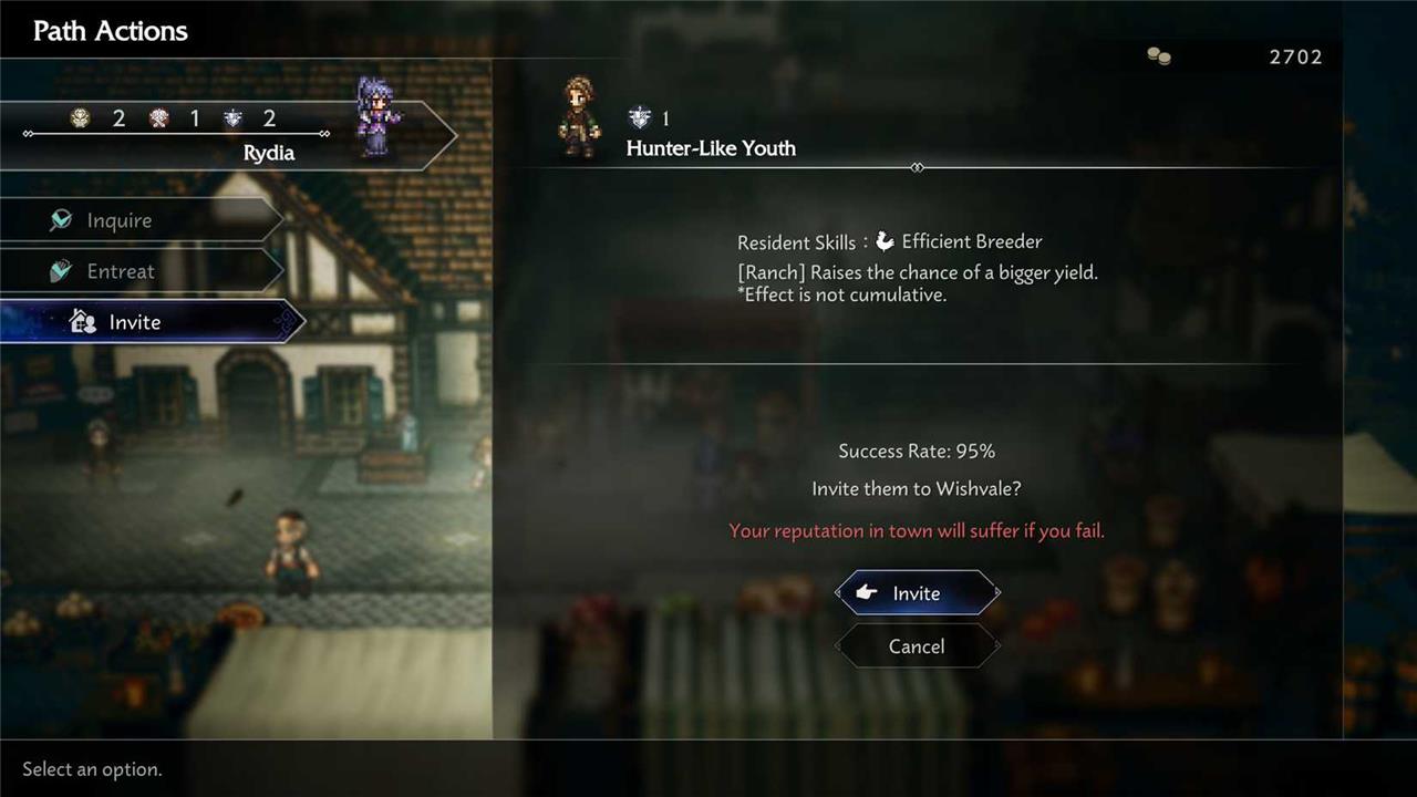 There are two situations you will face when inviting a character to live in your town. The most common is a kind of persuasion check. The game shows your chances based on your Fame, Wealth, or Power rank. If you fail, you lose one reputation point in the town, but if you succeed, then the character will accept moving to Wishvale. Otherwise, the character will have a specific request to fulfill before they’ll want to move to your town.