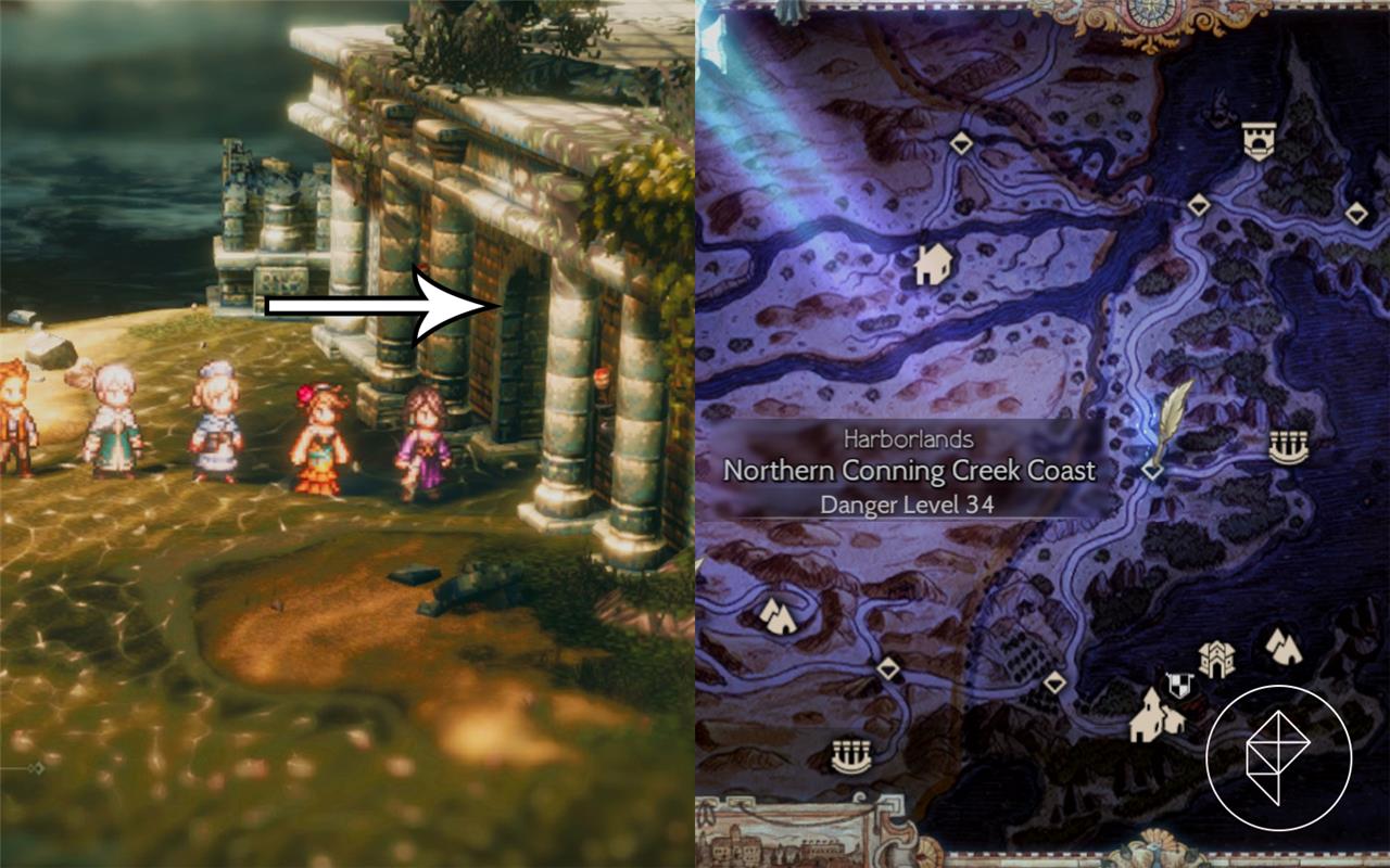 Northern Conning Creek Coast holds the Altar of the Charitable for Castti. From Conning Creek, head west to Western Conning Creek Coast, then north to the northern coast area. Go east past the save point near the woman waiting for her lover; shallow sands and water lead to a temple entrance on the right. Check the minimap for the pillar icon to guide you there, where Castti gains the Drastic Measures EX Skill.