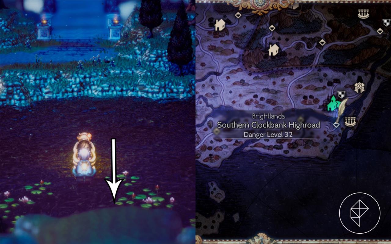 In Octopath Traveler 2, Throné’s Altar of the Prince of Thieves sits in Southern Clockbank Highroad. Players reach it by boat from a pier near the save point, sailing south through a narrow river gap marked by lily pads and the minimap’s pillar icon. Throné gains Veil of Darkness here, a 25 SP skill dealing dark damage to all foes while ensuring she dodges the next physical hit.
