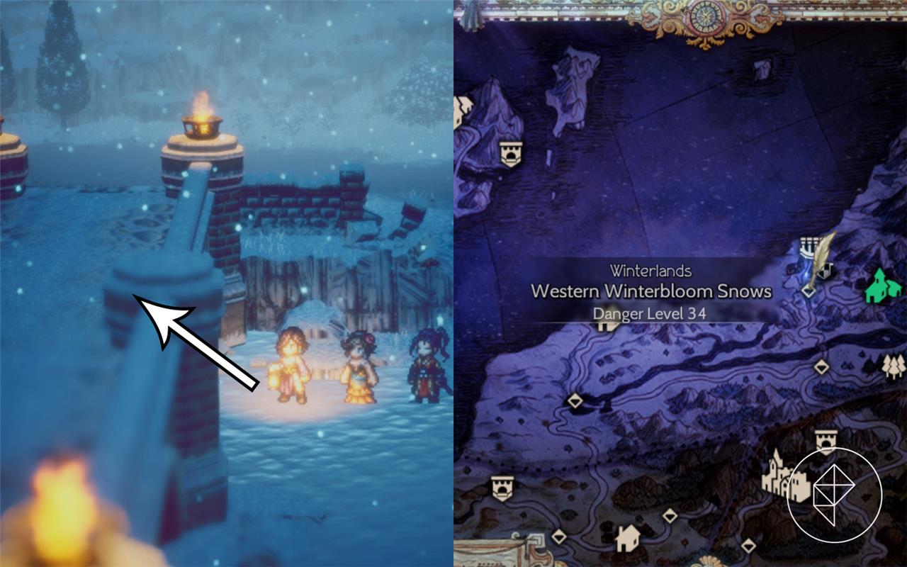 The Altar of the Scholarking for Osvald sits in Western Winterbloom Snows, with its entrance tucked under a bridge on snowy terrain that appears impassable at first. Osvald gains the Teach EX Skill there, a 12 SP ability that transfers his buffs to one ally for two turns. Look for the Job Altar icon on the minimap, four pillars linked by a curve, after reaching the frozen lake nearby.