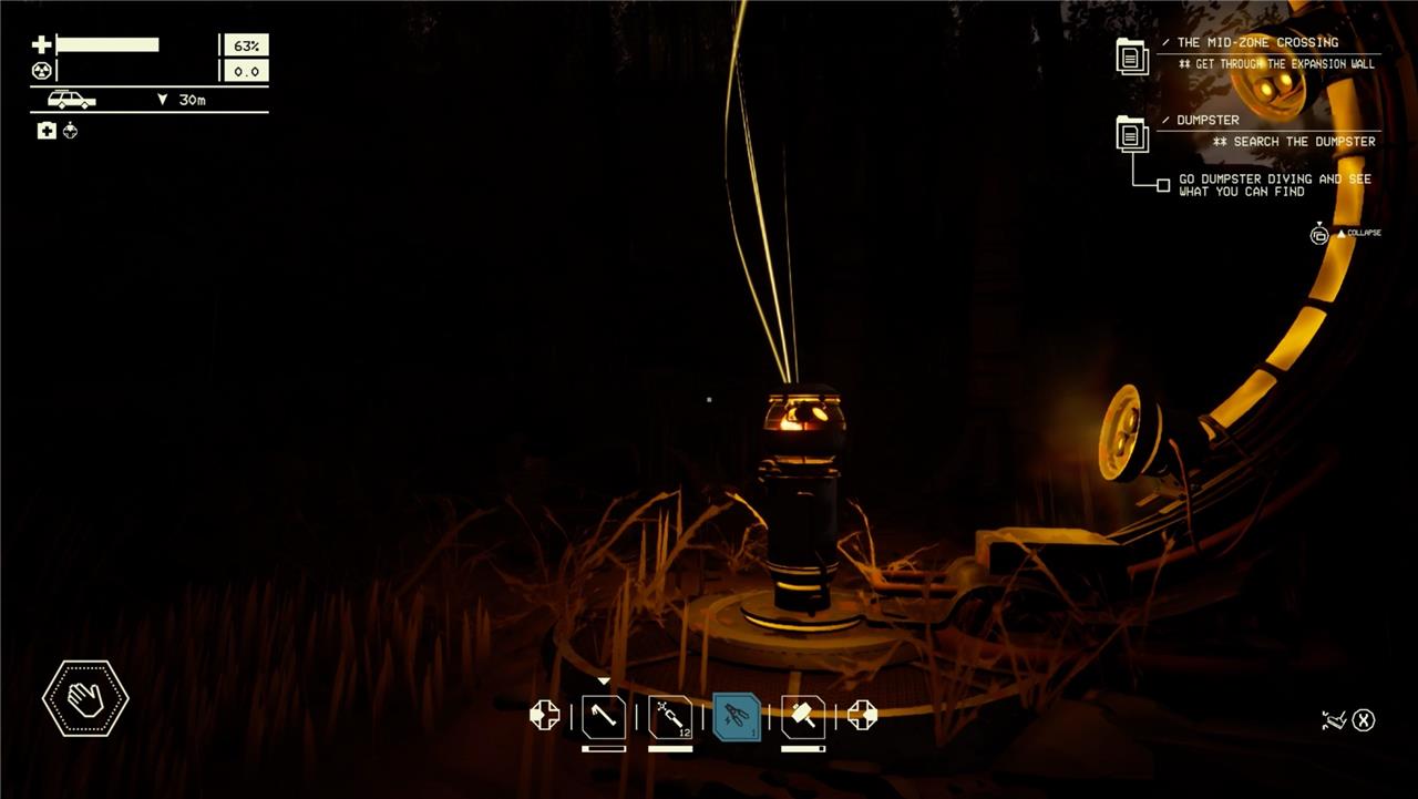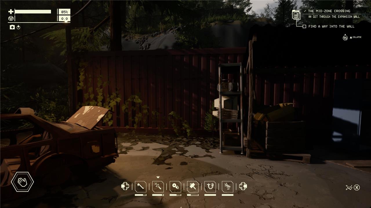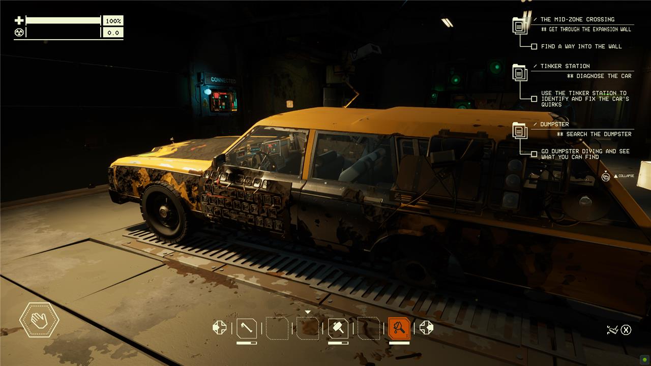 Interaction: Hold the interaction button to pick up items or repair parts on your car. Familiarize yourself with this to efficiently manage repairs and resource gathering.