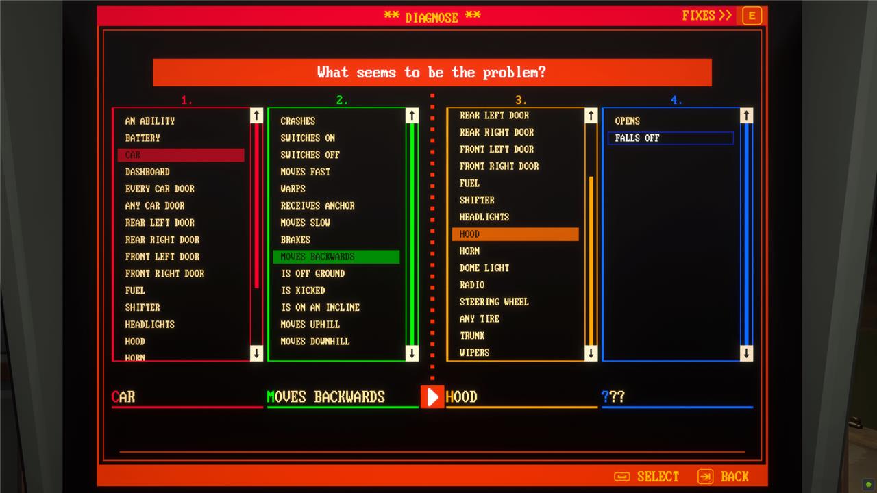 Pacific Drive doesn’t explain diagnosing quirks, so it’s a bit of a guessing game. On the computer, you’ll enter information to fill in blanks in a sentence. That sentence is, effectively, “if the [car part] does [action], then the [different car part] does [quirky action].”