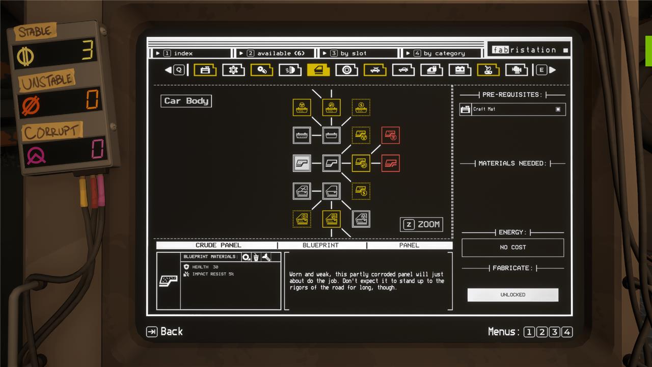 At the fabrication station, you’ll spend resources and stable energy (more on this in a second) to unlock things like new workstations at the auto shop, better tools, and new and better parts for your car.