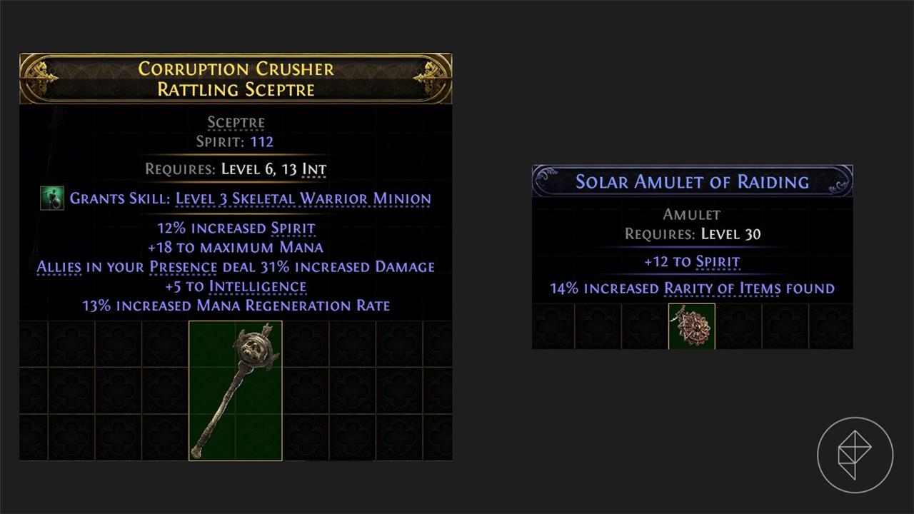 • Body Armours: These can also roll Spirit as an explicit modifier, typically ranging from about 10 to 50 Spirit. This is a good option if sceptres or amulets don’t fit your build.