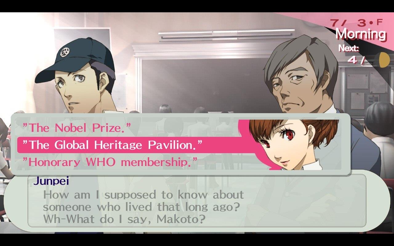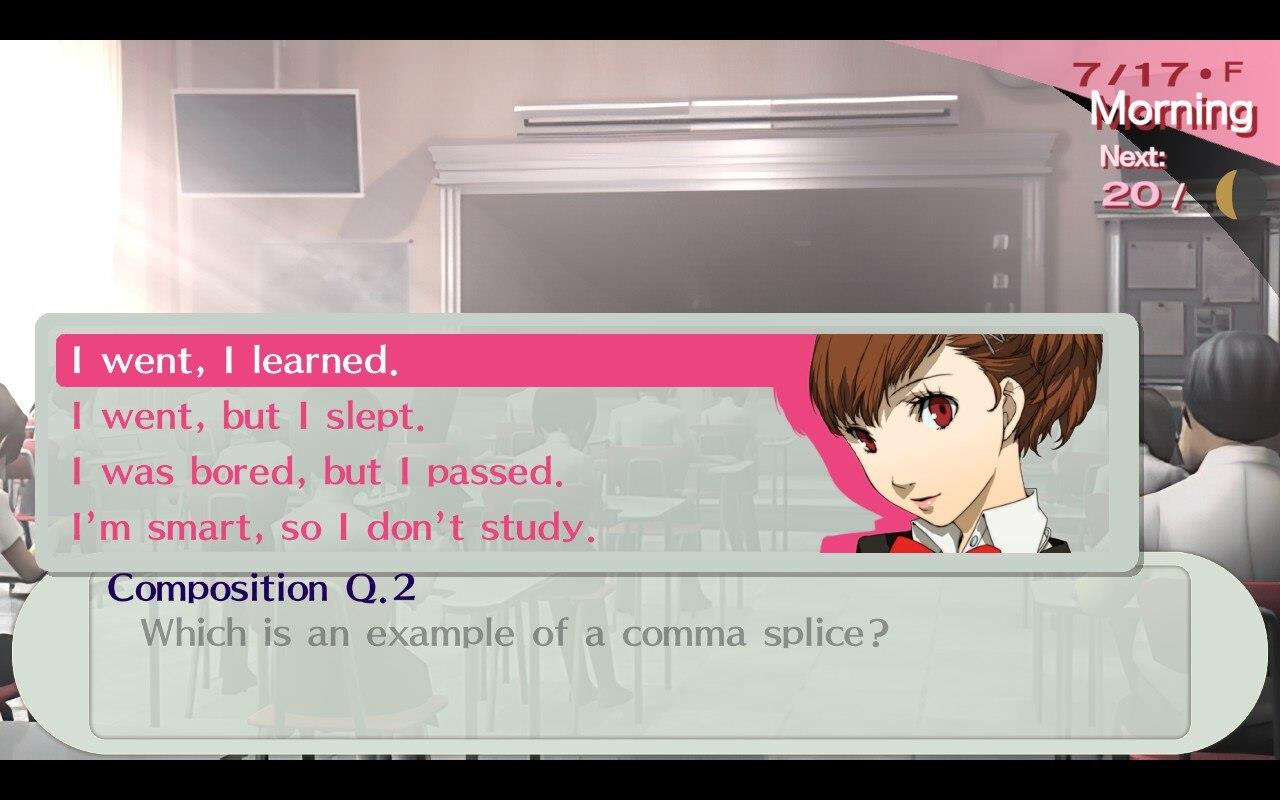 Second semester midterms bring a new round of classroom questions that test your memory and attention to detail. These quizzes can raise your Charm and Academics stats if you answer correctly, so keeping track of each day’s topics pays off. Questions range from history and literature to science, reflecting the broader themes of school life in Persona 3 Portable. Stay alert to both classroom hints and social links, as they can sometimes help you recall the right answers during these tests.