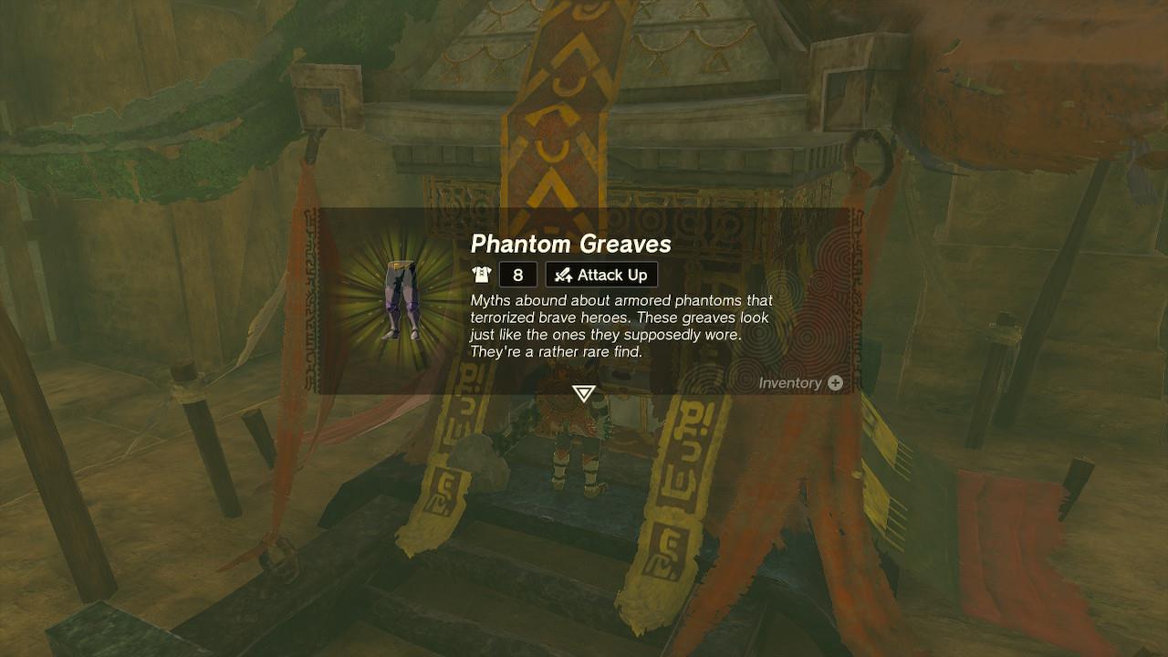 Upgrading the Phantom Armor set requires visits to Great Fairies and a steady supply of rare monster materials such as Lynel Guts and Hinox Guts. Each piece can be enhanced up to four levels, steadily boosting its defense rating. The set does not provide a traditional bonus when fully upgraded, but its main appeal lies in the powerful Attack Up effect granted when all three pieces-the Helmet, Armor, and Greaves-are worn together.