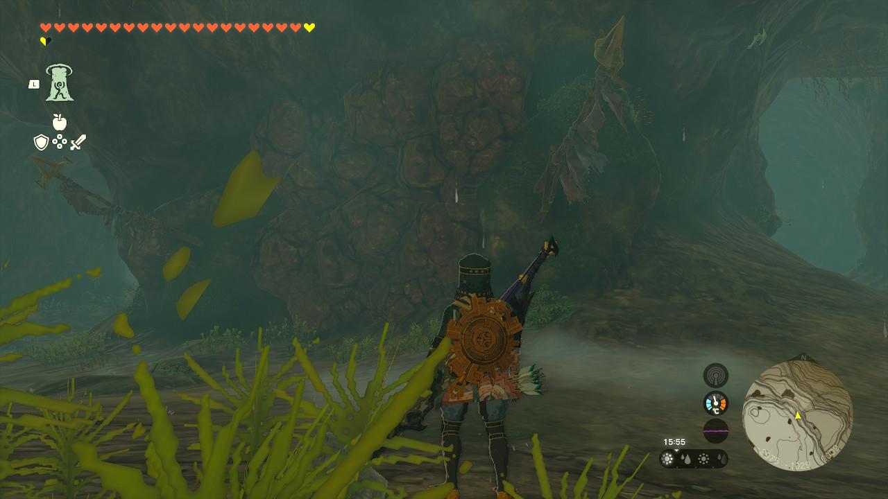 The more sensible route involves gliding down to the left of the shrine and following the path round to the right. Looking to the right, you will see that the wall is bricked up with breakable bricks, you can break using bombs, hammers, or Yunobo.