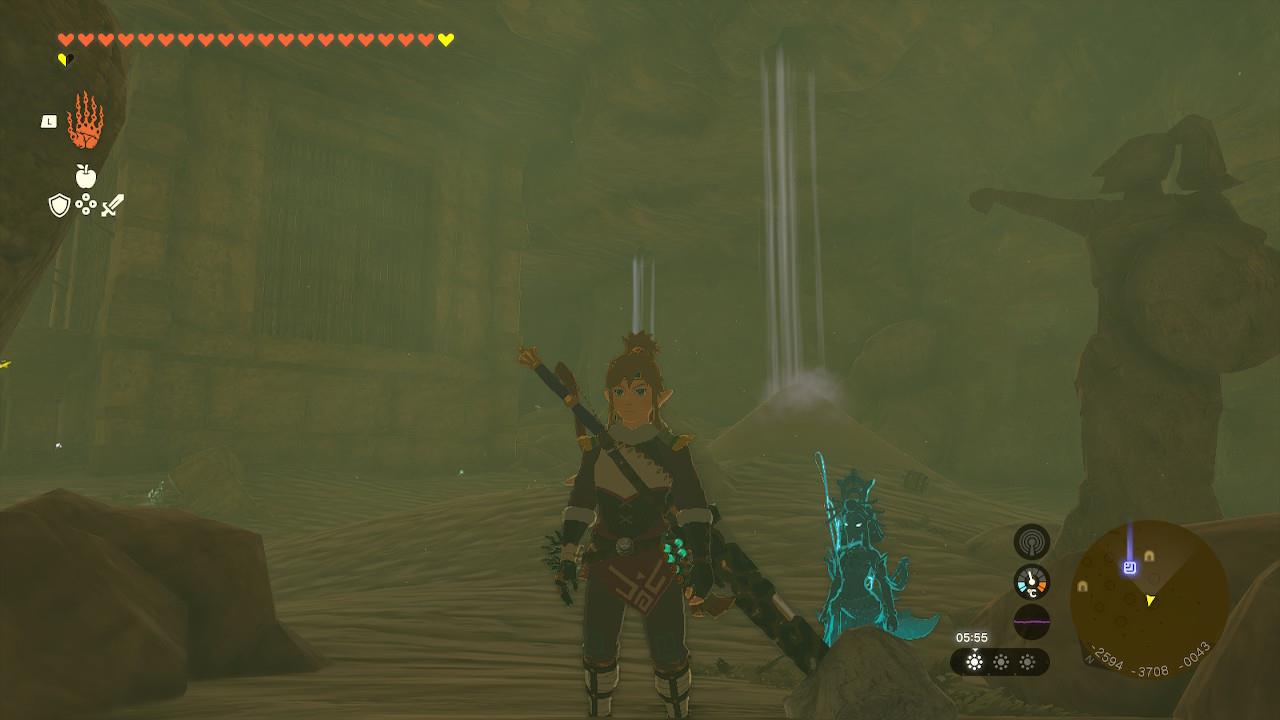 Phantom Greaves are found beneath the sand in the Eastern Barrens area of the Gerudo Desert, where several quicksand sinkholes lead down to the Ancient Altar Ruins. Glide or ride out to the cluster of sand whirlpools east of the main desert, then drop into the correctly positioned sinkhole near coordinates around -2520, -3730, -0030 to reach a small underground chamber. Inside, climb up to the raised ledge or altar with the treasure chest and open it to obtain the Phantom Greaves as the only notable reward in this room.โ