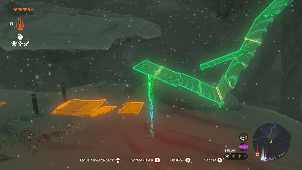 As you get close to the tower, you’ll notice a broken bridge, similar to the one you used to get to the spot. Thankfully, you can use Ultrahand to repair it, albeit not without some peculiarities. You can easily add all of the missing pieces back to it, stretching both ends enough so you connect them with each other.