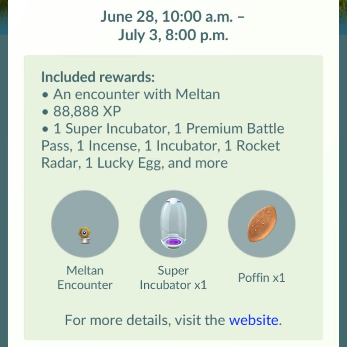 Rewards: 1x Super Incubator, Meltan encounter, 88,888 XP