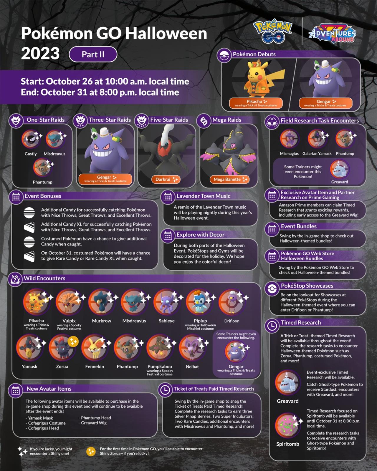 The Pokémon Go Halloween Part 2 Timed Research event runs from October 26 to October 31, 2023, featuring a Trick or Treat-themed Timed Research quest. Players can complete tasks such as earning candy with their buddy, making great throws, catching Pokémon, and spinning PokéStops to encounter Halloween-themed Pokémon including Zorua, Phantump, Misdreavus, Noibat, and costumed Pikachu and Gengar. Completing the research rewards encounters with these Pokémon, Stardust, and Rare Candy. This event continues the Halloween celebration with exclusive Timed Research focused on Ghost-type Pokémon and Spiritomb, enhancing the spooky atmosphere with special bonuses and encounters.