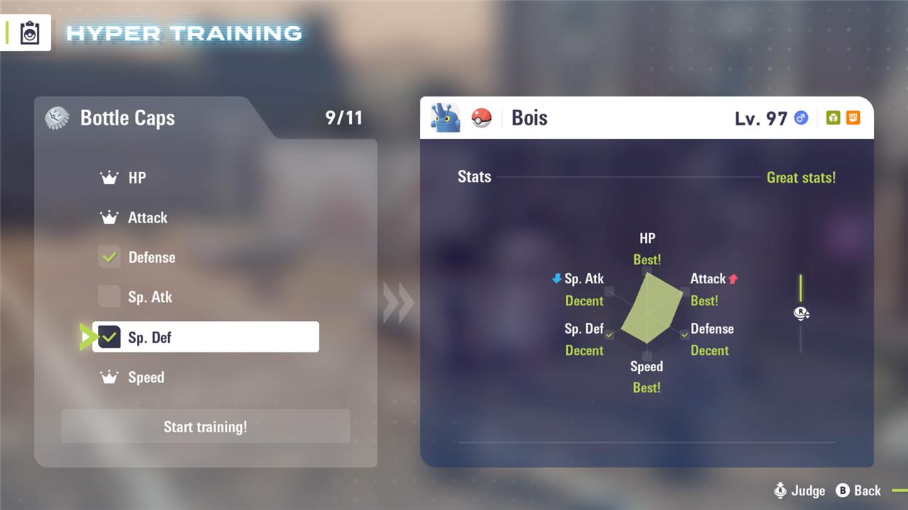 Once you talk to her, she’ll ask which Pokémon you want to Hyper Train and what type of currency you’ll want to pay with. If you choose regular Bottle Caps, she’ll ask you which stats you want to raise – in which you can pick multiple to train at once.