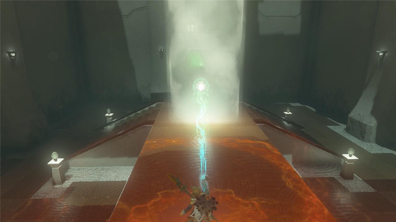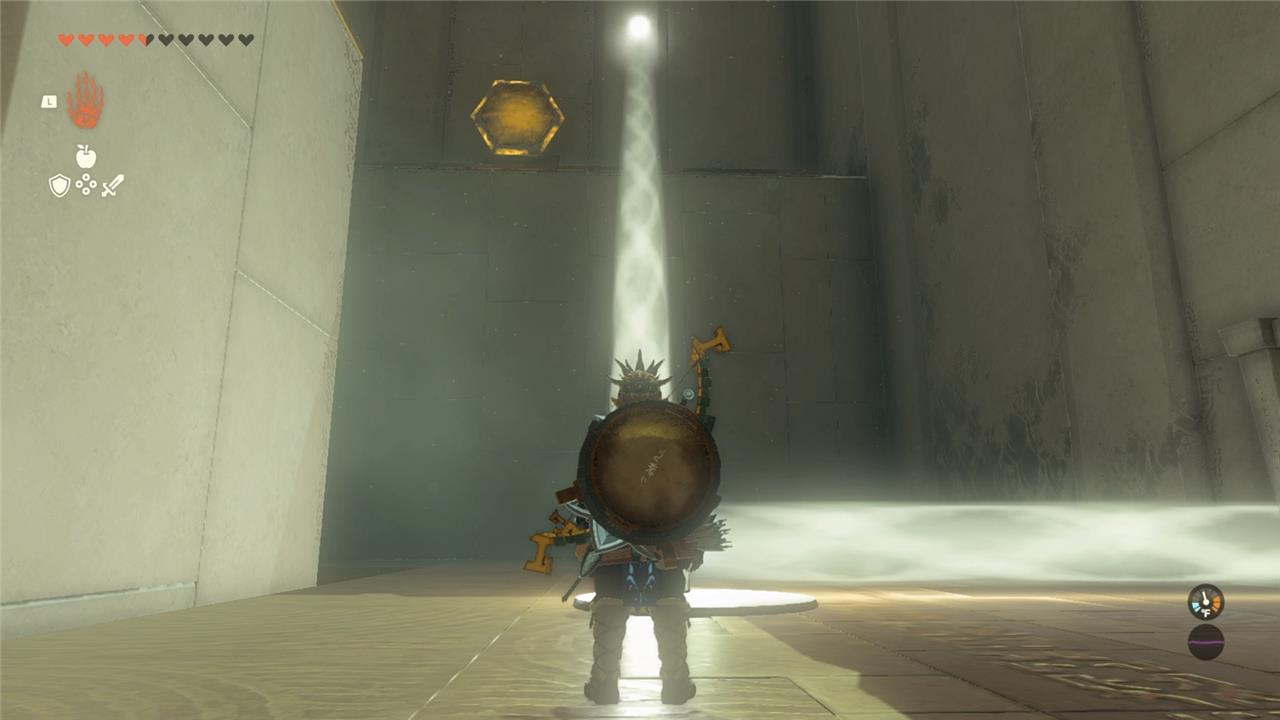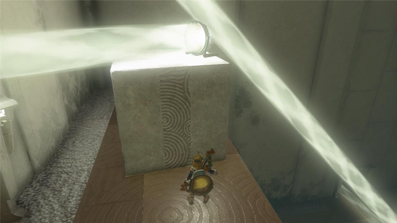 1. In the first room of Rakashog Shrine, you’ll see a large beam of light pouring down from the ceiling. Walk past the beam and you’ll see a yellow hexagonal light sensor above a locked gate and a mirror on the floor to the left of the gate.