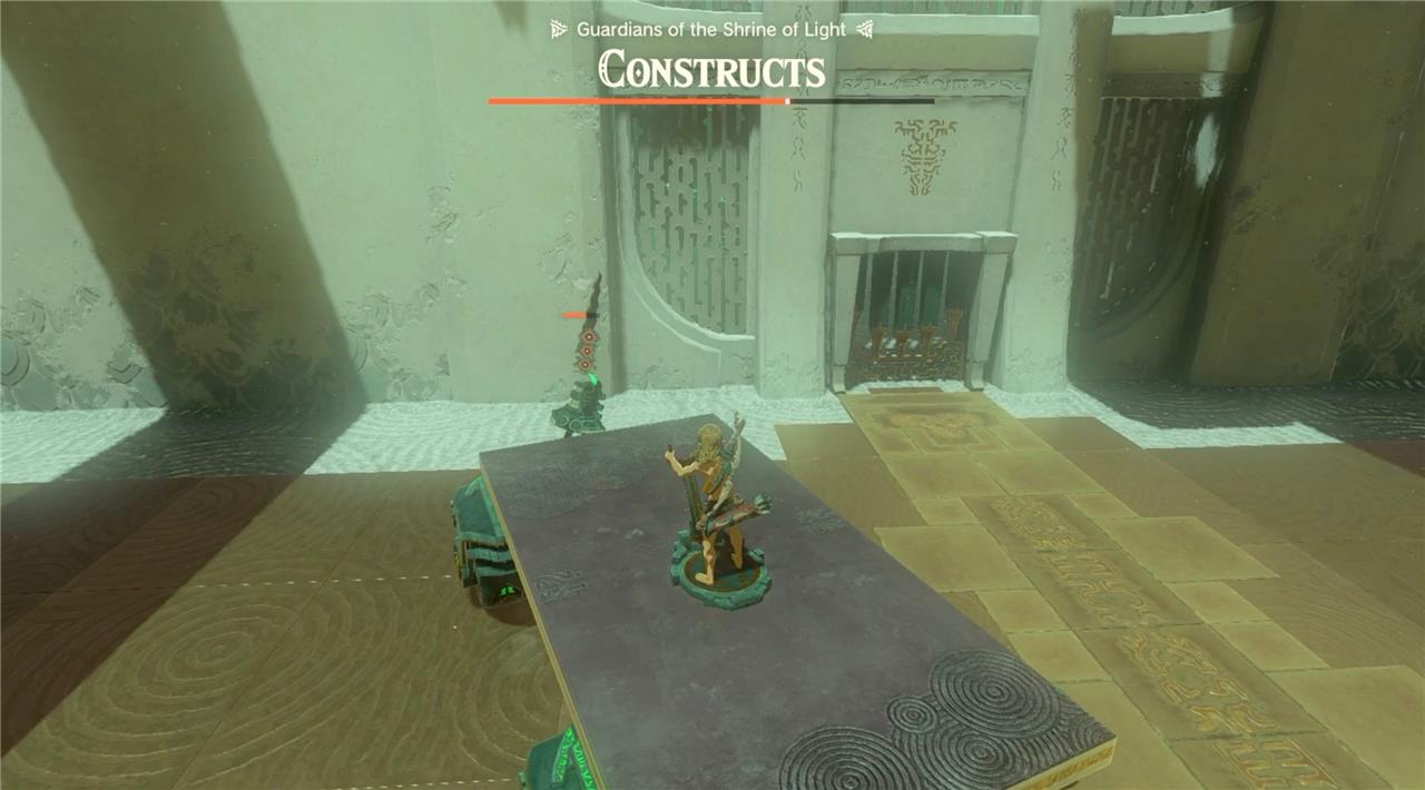 2. Run into the main chamber of the shrine to find a Construct guarding a fan cart. Defeat the Construct with a quick arrow to the eye and few whacks of a stick. Use Fuse to bolster your stick with a Soldier Construct horn.