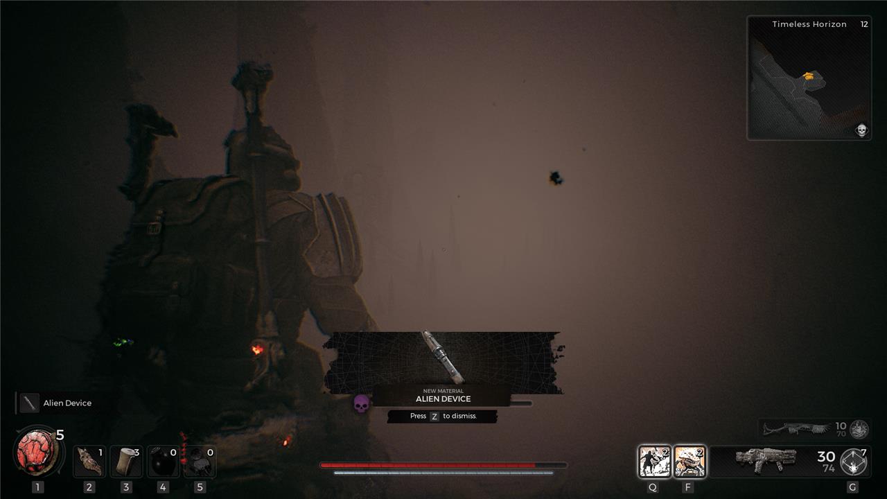Run through the gap – ignoring your character’s coughs – and jump from one cliff to the next once you reach a hole in the ground. Quickly grab the armor off the body on the other side. Then jump off the cliff to the smaller platform below. On the ground, just before you die, you’ll find the Alien Device. Grab it and succumb to your fate.
