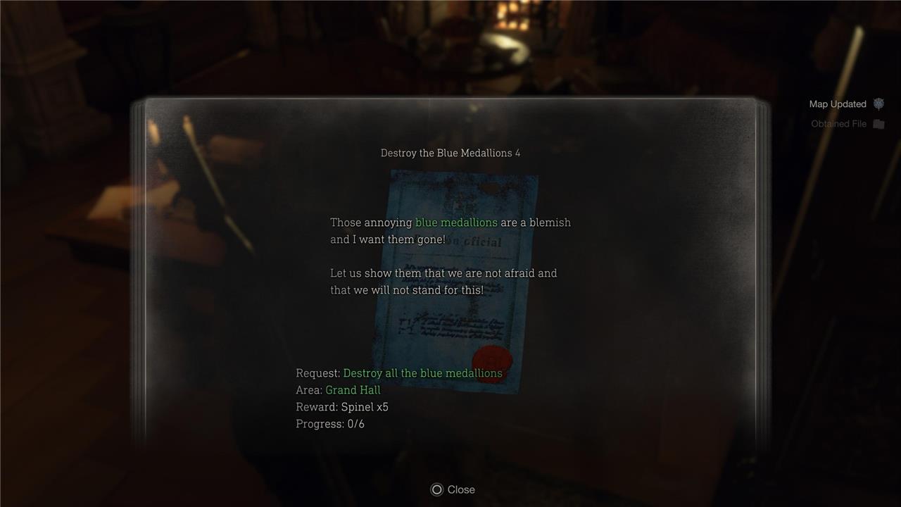 Requests in Resident Evil 4 Remake are optional side missions that players can complete for rewards such as Spinels, which can be exchanged for valuable items. These tasks range from destroying blue medallions and selling specific treasures to defeating certain enemies. Requests are usually marked with blue slips found around the environment, often posted near merchant areas or major locations. Once accepted, progress is tracked in the menu, allowing players to complete them at their own pace while exploring each chapter.