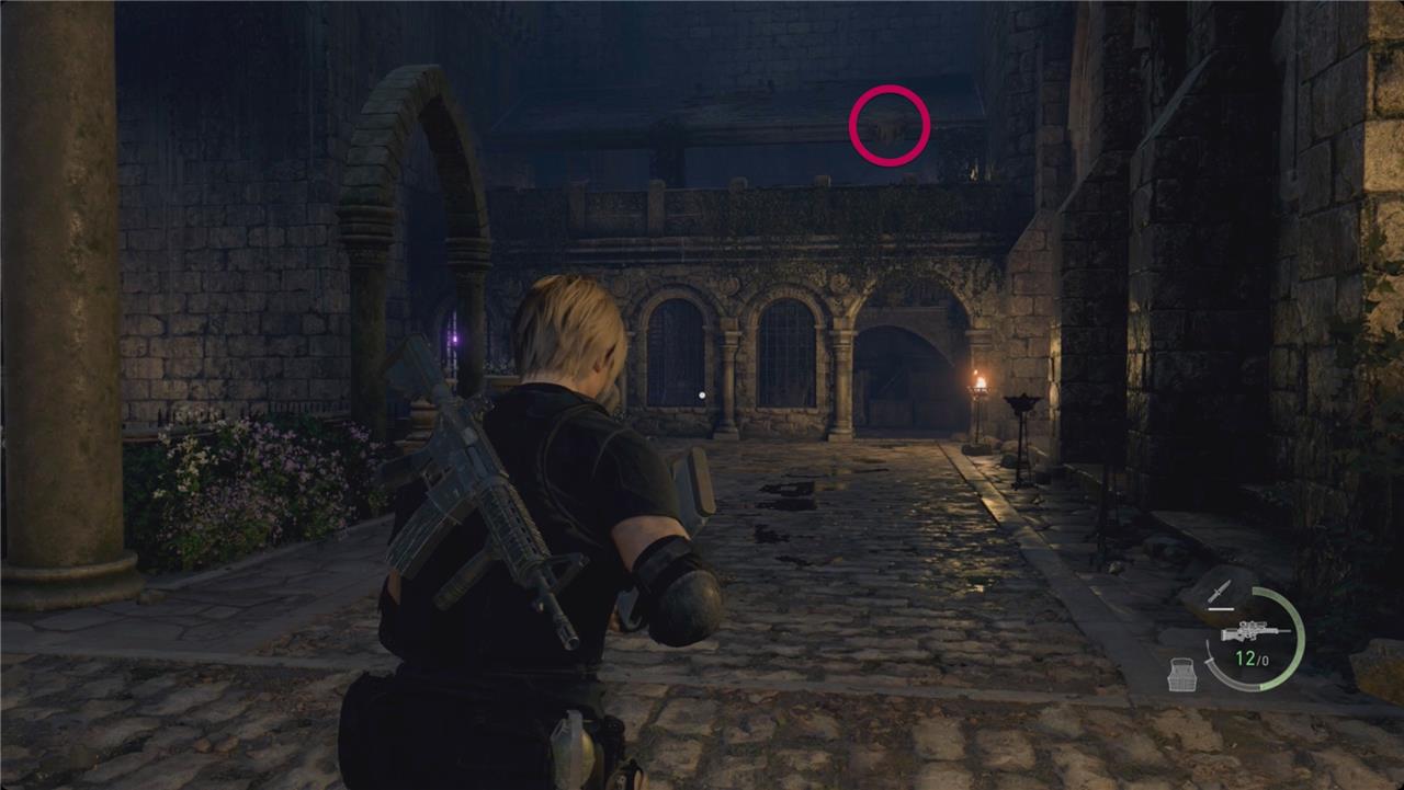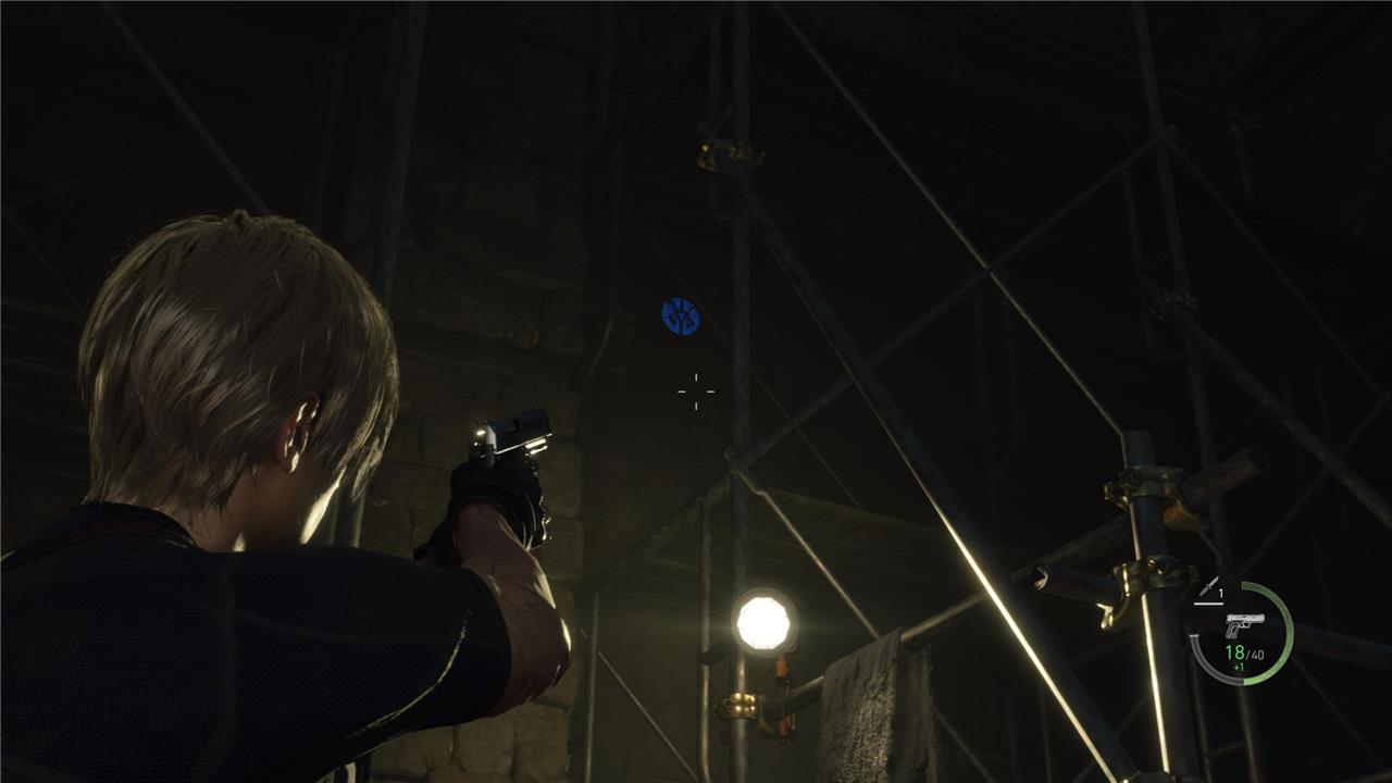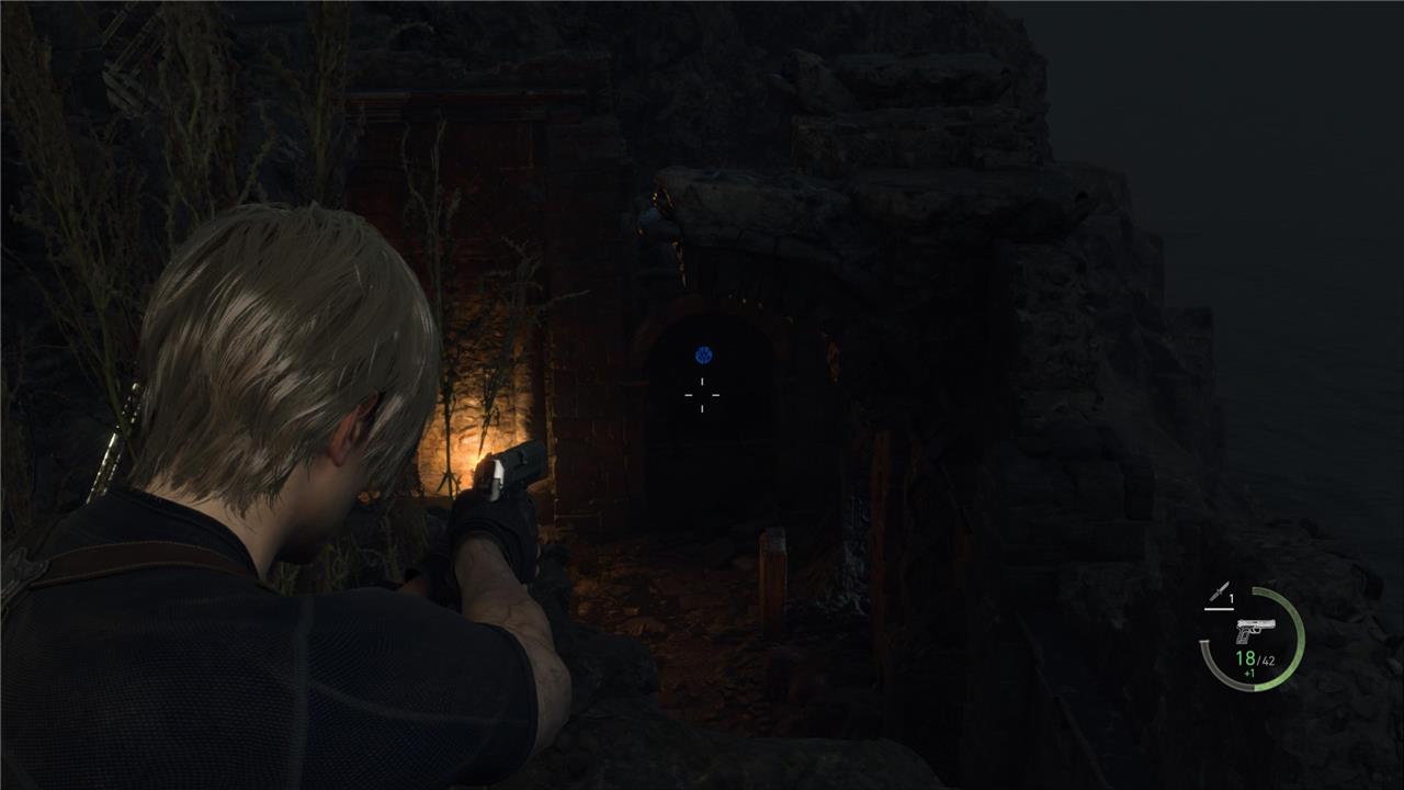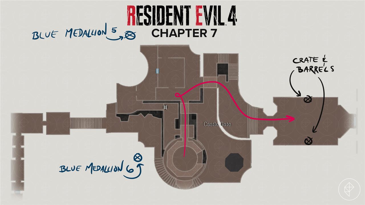 In the Castle Gate area of Resident Evil 4 Remake, six Blue Medallions hide among structures during Chapter 7. Spot the first in a window atop the roofless building near the start; turn north for the second in another window above it. Shoot the third high on the distant wall, then drop under the raised cannon platform for the fourth dangling below. Climb the nearby ladder into the building for the fifth on the wall by a chest, and head toward the chapel’s castle wall to find the sixth hanging from a tree branch. Destroying all six earns five Spinels from the Merchant.