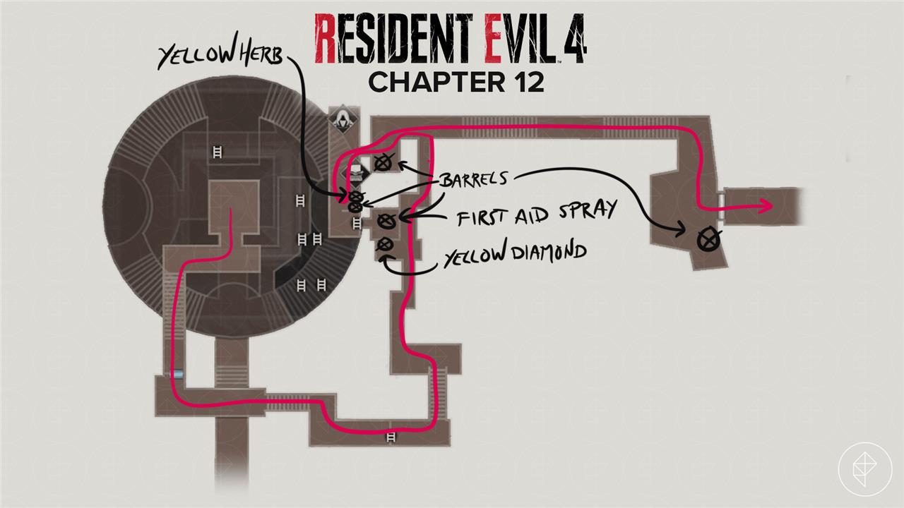 At the far side, turn left to find a barrel with pesetas. Duck through the door to find a Merchant room. Check the left for a yellow herb and a barrel with handgun ammo. Behind the wall, climb the ladder to find some first aid spray and two barrels with pesetas and another first aid spray.