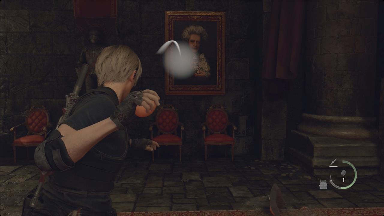 In the back right corner, grab the Boot Knife from the portrait and smash the vase to the left for some pesetas. Continue around counterclockwise and smash the vase next to the throne for more pesetas.